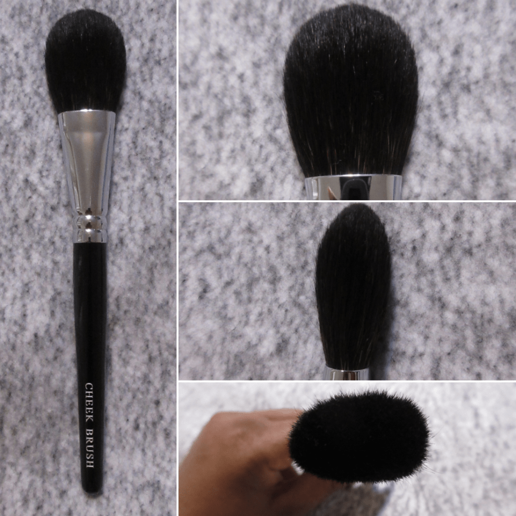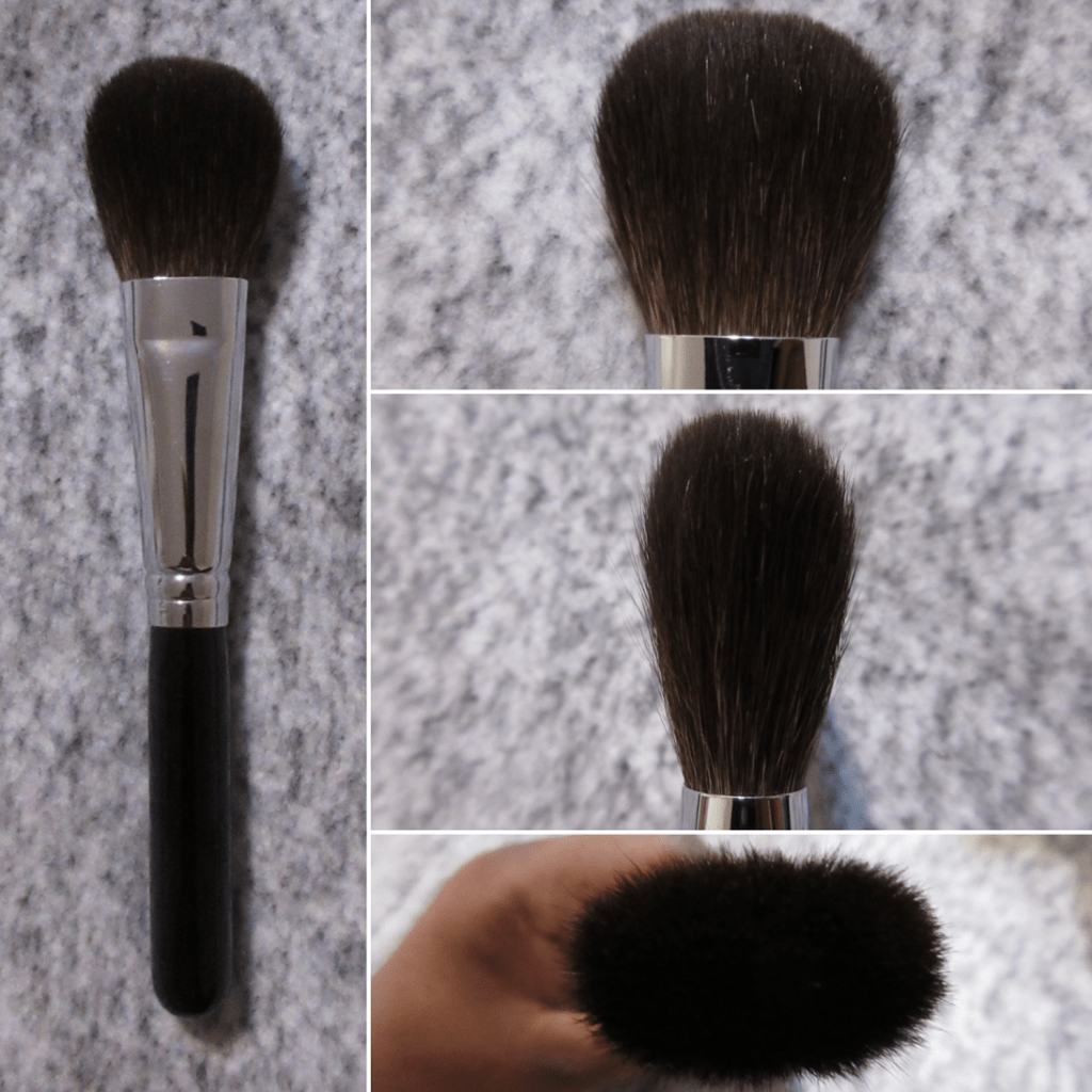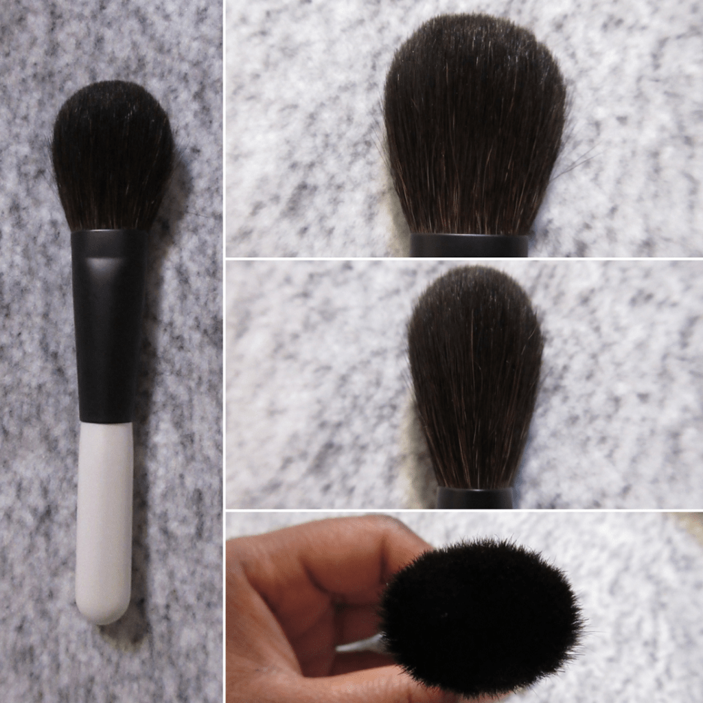 This oval shaped brush is a squirrel goat mix that has the highest percentage of goat to squirrel ratio in this post. It’s soft enough, but the way the hair is packed means I can feel a distinct difference between this one and the other mixed brushes reviewed here today. I can feel a bit more friction on the skin when I use it. It feels dense, but it still splays quite a bit when pressed on the skin, making it not great to use with highlighter. I typically prefer round brushes over round-flat, but this brush is so packed with hair that despite the pinched ferrule maintaining the round-flat shape, this brush after being washed and left to air dry without aloe vera gel or a brush guard fluffs a little closer to a circular shape. So, it feels natural when using it to sweep on bronzer, but I intuitively switch to buffing when I use it on my cheek for blush. Because of this feature, I ended up liking this brush more than I expected. It picks up a decent amount of product with each tap in the pan. It’s not an essential brush in my collection, but a nice one to have. I would have liked it even more if the handle was longer, but this is one of the outlet brushes I bought before I finalized my stance on getting face brushes at a minimum of 135mm in full length. The original price of 4200 YEN would have been okay with me, but getting it for 2520 YEN makes me feel all the better about getting it.