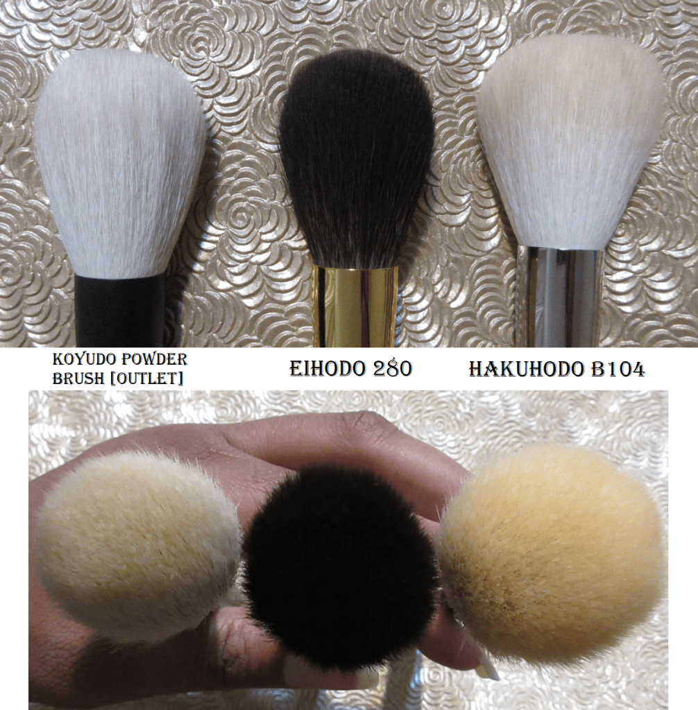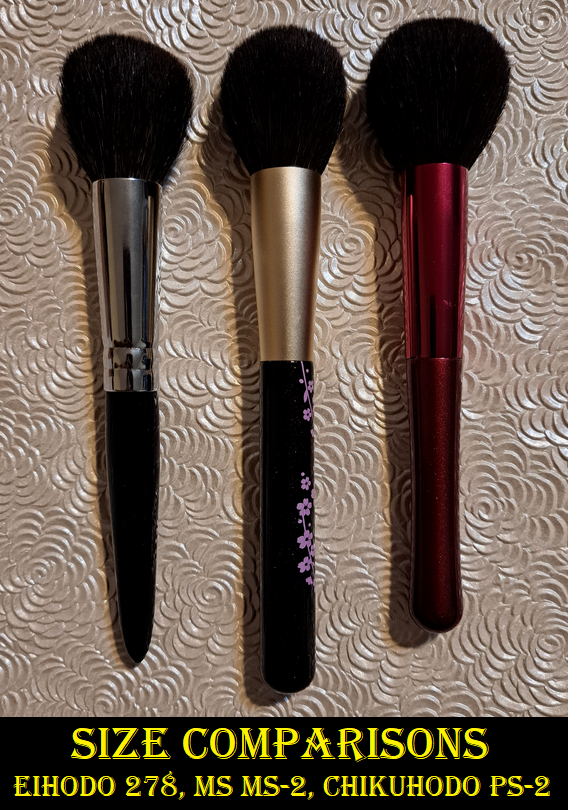 Comparing other round brushes I own that are wider at the tips than they are at the base, the closest I have in size to the Eihodo 280 is my Koyudo Saikoho Powder Brush (another outlet brush) and Hakuhodo B104. The B104 is in the long handle version, which makes this brush a comparable length to the Eihodo, although the brush head is bigger. The Koyudo brush is a lot closer, but still bigger. I thought it might be a good comparison though because I suspect the Koyudo brush is similar to the rephr 30, (though I don’t have it to confirm it).