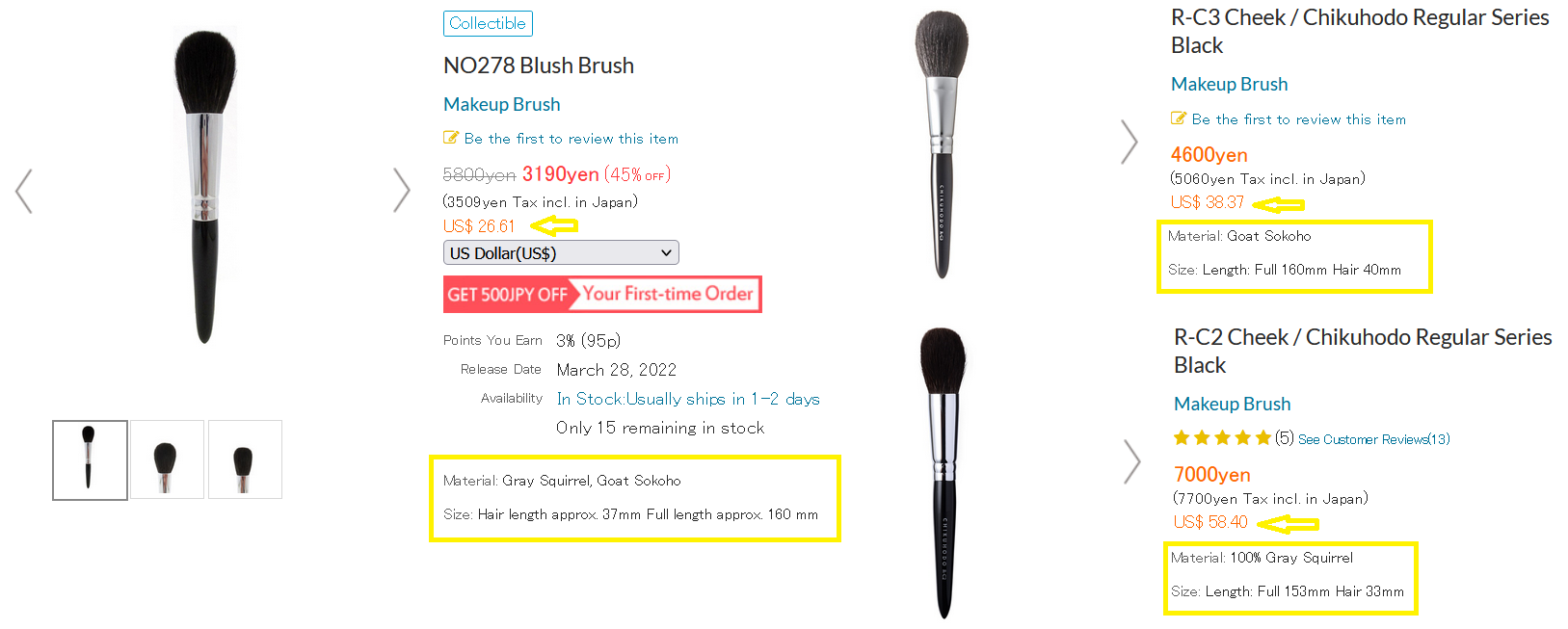 The brushes in the “Special Price Events” tend to sell out fast depending on the hair type and whether or not the brush is in a very popular style or an aesthetically pleasing handle. For instance, Canadian Squirrel tends to go the quickest. It could be within 5-30 minutes depending on how many CDJapan stocked and the price of them. From what I’ve seen, the pricier outlet brushes only have 5-15 available with five being the average. Gray Squirrel is usually gone in under an hour. Squirrel mixed with goat could sell out within minutes or weeks. There are a lot of variables.