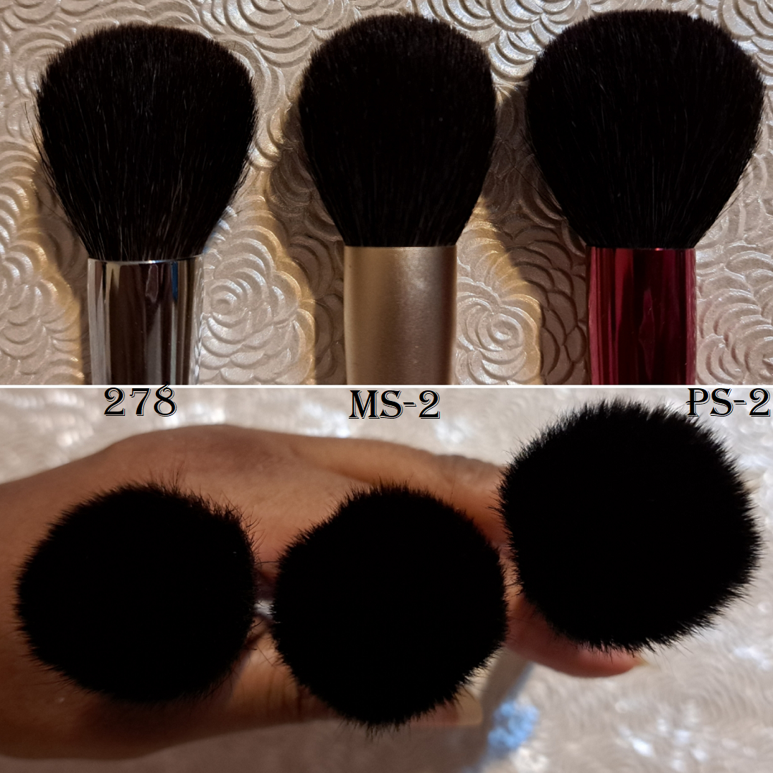 This brush head is pretty much the same length and width as the MS-2, but the shape is similar to the PS-2 in the way that the tips form enough of a curve to barely avoid being considered a flat top. If these three brushes represented a family, they would be cousins. The MS-2 and PS-2 perform similarly because of the tightness of the bundling in the center, which is also the case with the 278, but because it has even more of the gray squirrel in it than the MS-2, the hair is so fine that it curves even more under pressure and doesn’t bounce on the skin as well as the others. The hair bends enough that I can actually use this for sweeping with bronzer without it feeling awkward; and because of that near-flat top and how dense it is, it still makes for a great buffing brush. So, for use with both blush and bronzer, I like to apply those products in a circular buffing motion. It surprisingly picks up a lot of product, so I have to just do a dab or two at a time in the makeup product and knock off the excess before using it on my face.