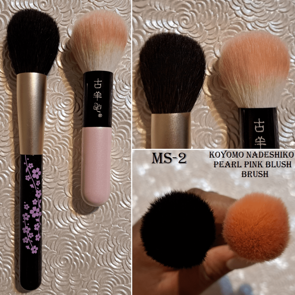The HS-2 Hana Sakura is one of my favorite brushes and it’s quite versatile. The MS-2 isn’t as versatile for me, but has proved to be an amazing dedicated blush brush. This shape is similar to the Chikuhodo T-4 and PS-2, so it performs similarly to them, but with a smaller brush head. I love the spring back when I pounce it on my face, but I can use it in any application method. It’s a medium density brush that’s packed tightest in the center and the flexibility of the hair allows it to curve enough to function like a sweeping brush if used in that way, but also stand firmly enough to be used in a buffing motion if so desired. The handle length is great for me and it looks so much prettier in person when I can see the sparkles in the black lacquer of the handle and that pretty flower pattern too. The head size is on the smaller side, but the splay from the outer ring keeps it from feeling too small when I use it.