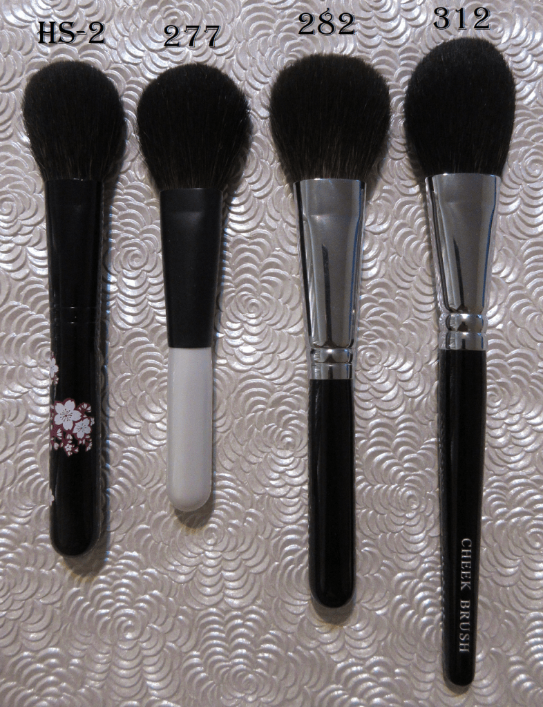 This 282 brush is like the longer handle full squirrel version of the 277. It’s of course softer than the 277, but this isn’t the softest gray squirrel hair I’ve ever felt. It’s closer to the feeling of the best Saikoho goat brushes I have, but with a more delicate hair structure. I appreciate though that they really packed this brush with a lot of hair, so it’s dense, but it still has a large splay when pressure is applied. It’s every bit the sweeping style brush that I expected. It doesn’t pick up a lot of product unless the makeup is loose or loosely pressed. This brush ranks slightly above the 277, and I like having it, but it still wasn’t a necessity. According to Fluffy Fude, this brush is very similar in shape to the Chikuhodo Z-4, which is a brush I’ve considered getting for years, so I feel like I definitely don’t need a Z-4 anymore.