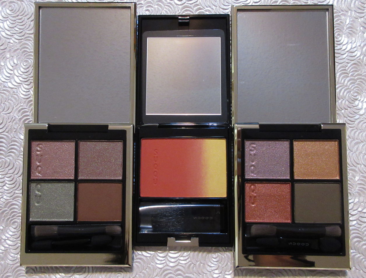 There are a few additional points I have left to make regarding the quads. One is that the applicators and brushes included in the compact actually work well. I usually get rid of them, but decided to try these for the sake of the review and was quite surprised to see how useful they were for getting in the inner corners, building up color precisely, and blending. I’m actually planning to keep them in case I travel with one of the Suqqu palettes. Second, is the fact that these compacts are sturdier than the single blushes and feel more like Suqqu’s 6 pan blush/highlighter compacts. It’s still lightweight, but about twice the thickness of the individual blush compacts.