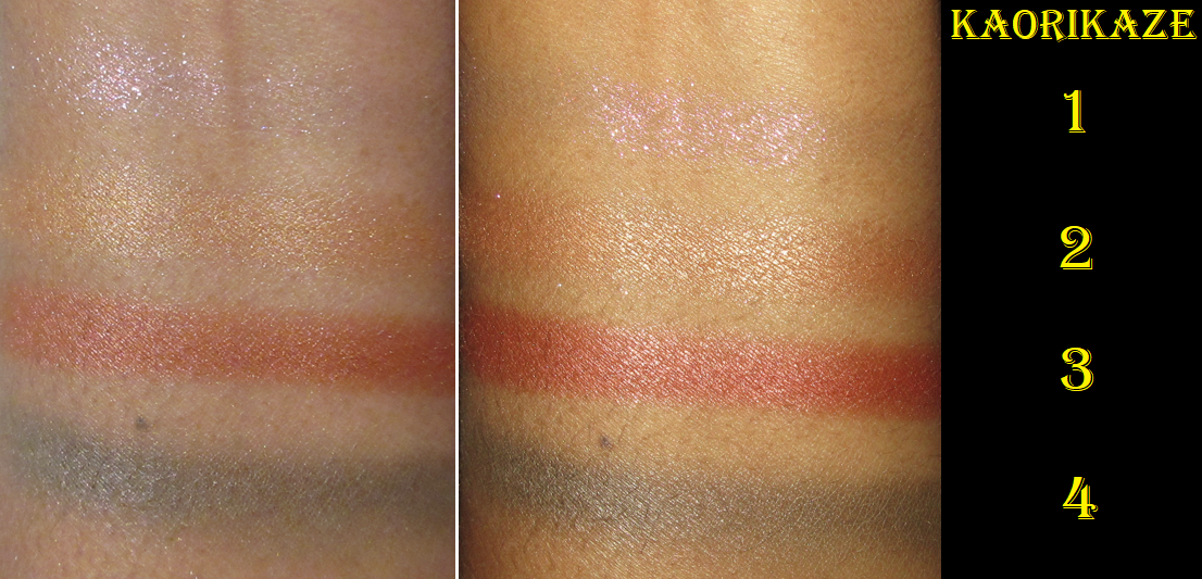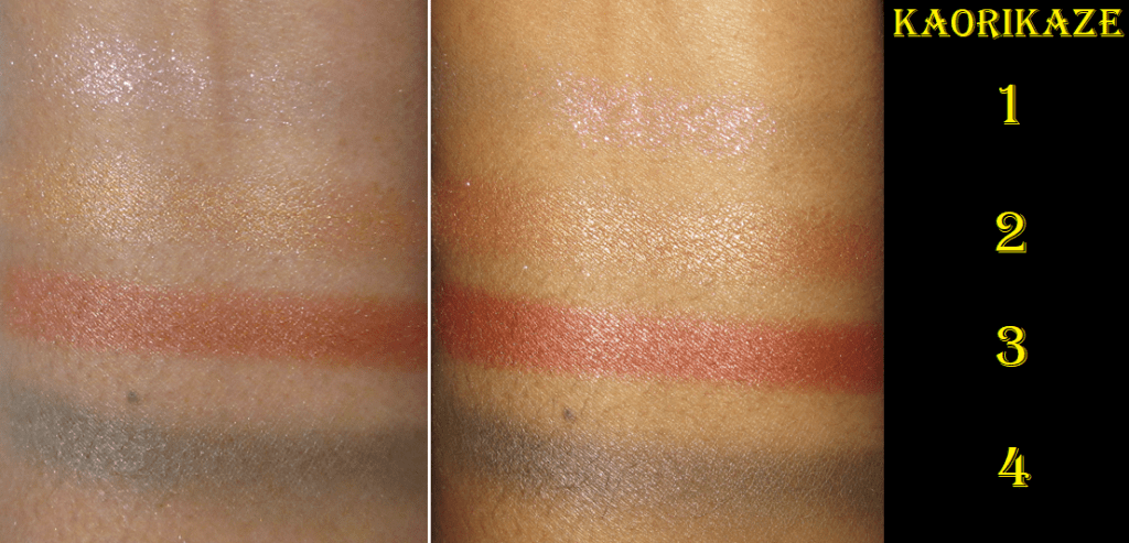 As usual, my swatches are done with a finger on bare skin. This time, however, I built up 1-3 swipes of each eyeshadow. The left photo was taken without flash and the right photo has flash on.