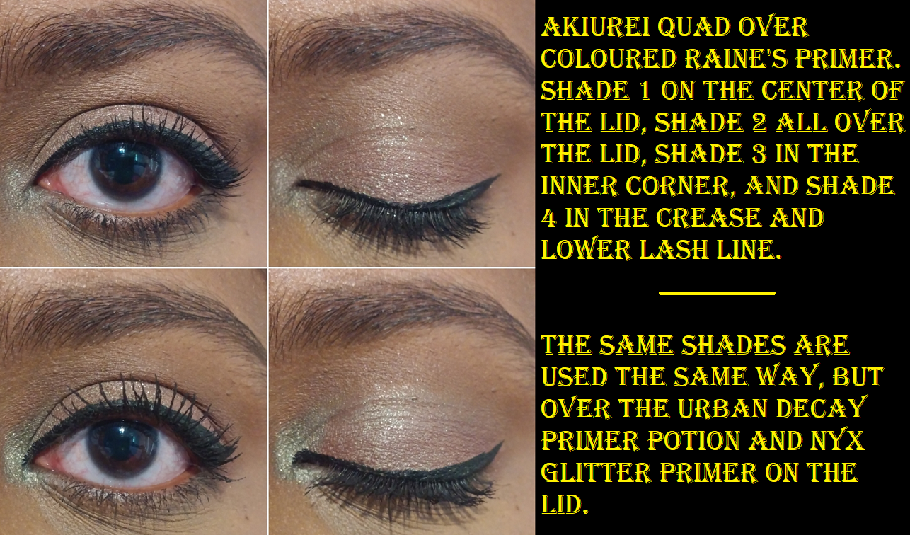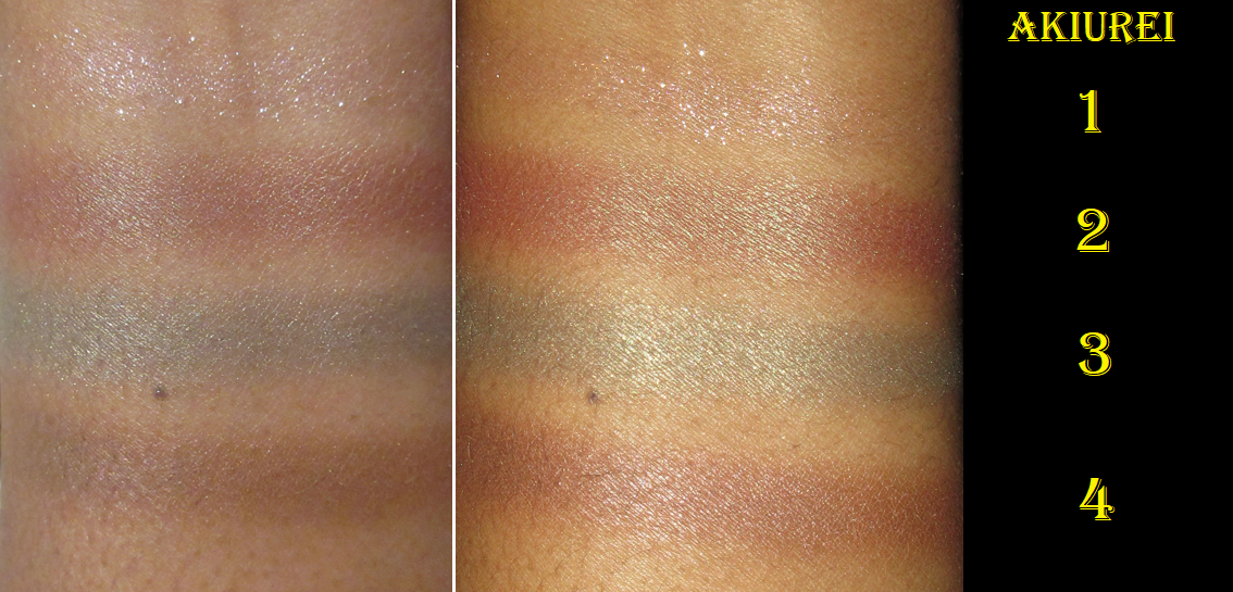 Shadows #2 and #3 from Kaorikaze are the most pigmented of the shimmers. They are coincidentally the only ones I don’t feel forced to use with Nyx Glitter Primer. As I mentioned before, I do like intense eyeshadows, but I was fully prepared for these to be almost like a wash of color. Technically the pigment level is satisfactory to me, but the inability for most of them to stick to my lids is how they end up blending away and appearing far more subtle than I prefer. So, using them with the tacky primer is how I feel they should normally look. This is especially the case with Shade #3 from Akiurei that has less of a sticking issue than some of the others, but it has a problem with the pretty sage green dulling down tremendously and losing all shine very quickly unless it has help from the primer.