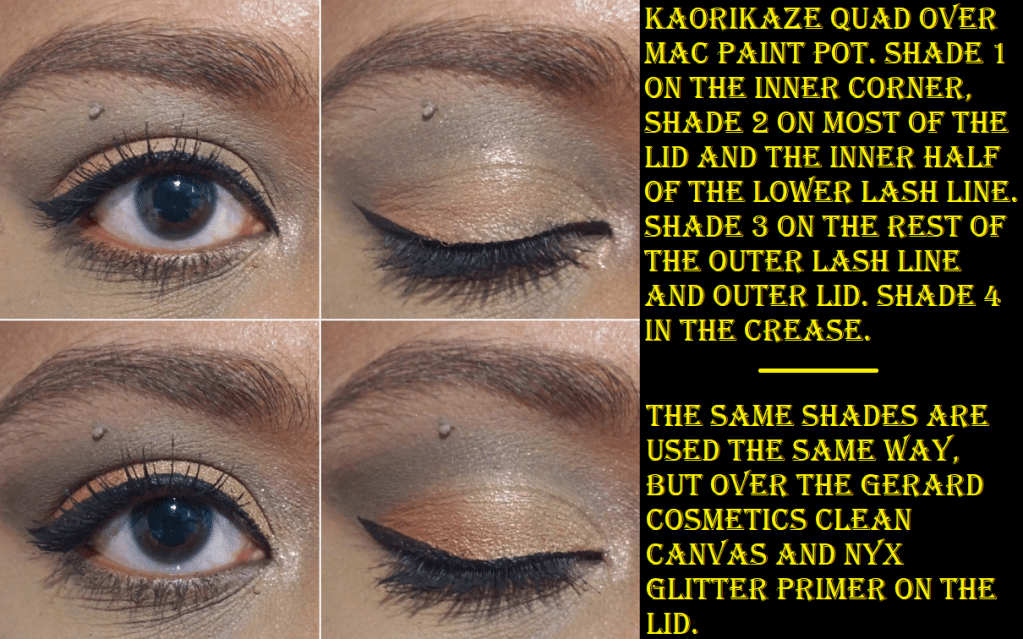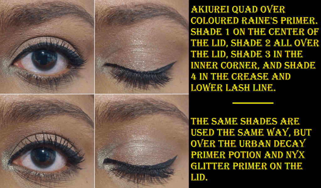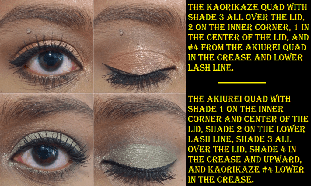 When it comes to the shimmers, that’s where the struggle occurred. I fully expected them to be soft and for the sparkle to not be very reflective, but I was unprepared for the trouble getting the shadows to stick to my eyes. It’s especially strange since my eyelids tend to be oily, so I don’t usually get that problem. Shadow #1 from Kaorikaze was the most difficult of the bunch and would not stick to my eyes, even if I wet my brush, unless I used Nyx Glitter Primer. Shadow #1 from Akiurei had better sticking power on the center of the lid, but still needed the Nyx product for the inner corners. With the majority of shimmer shadows in my collection, using my finger to apply a shadow or using a damp brush is enough to make a lid shade pop. However, the Nyx Glitter Primer was the only thing that successfully intensified the looks of these shadows and increased the longevity on my eyes.