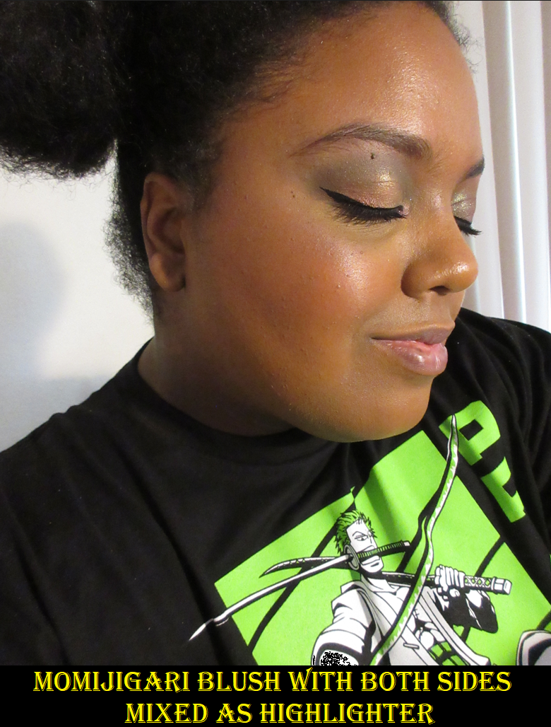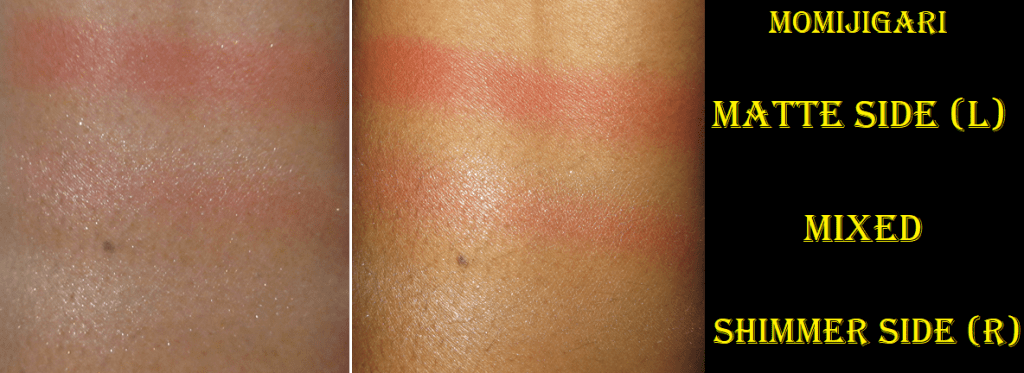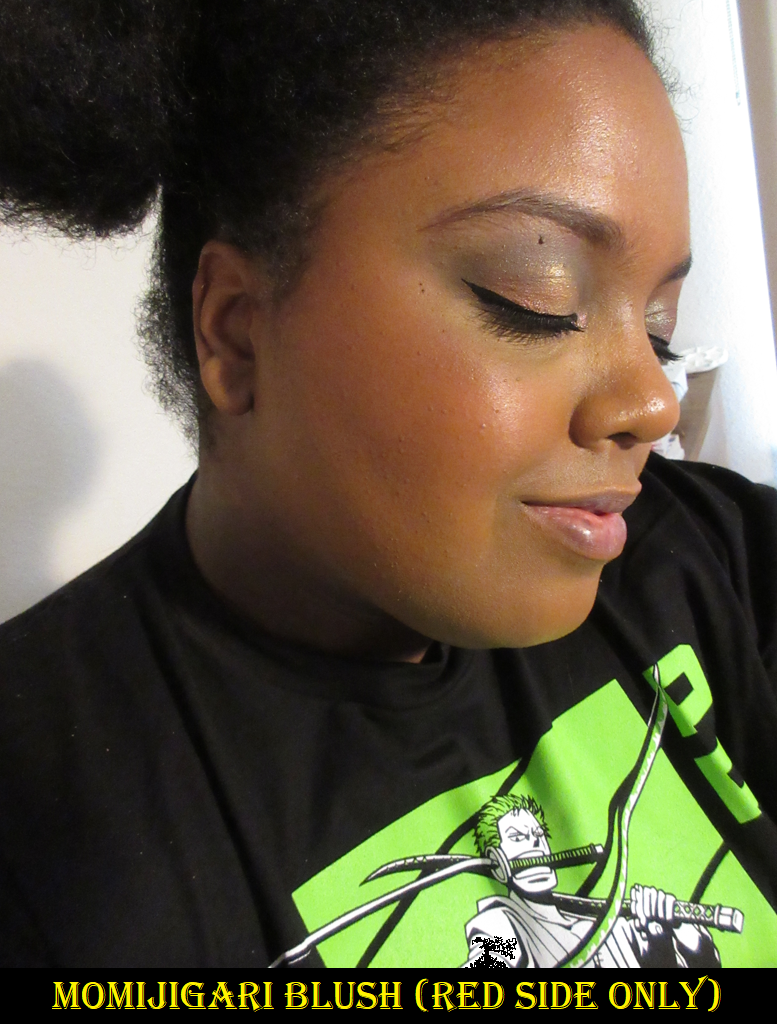 I love the red side, and I had assumed the shimmery portion that can be used as highlighter would match the yellow of my skin tone and be a great pairing. However, the yellow color is lighter than it appears in the pan and has a whitish base to it, which makes it look super contrasting on my skin. I cannot use it alone. Instead, I mix some of the yellow with the red edge that connects the two shades and it essentially turns into a pink. When that mix is applied over the blush, it creates a subtle gradient where the pink meets the red blush. And because the combination removes most of the ashy tone from the yellow, it allows the highlighting effect to come from the sparkle and not the stark base. Granted, the shimmer itself is still white/silver, so it’s not as flattering on me as a yellow gold tone would be. However, I think I can pull it off when using this technique. It’s not too crazy and I’m happy that it’s at least wearable. I have the option to use it if I want.