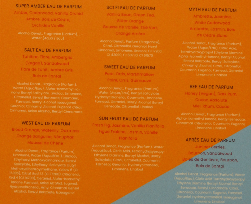 My favorite perfumes are gourmands (desserts and fruits in particular). I don’t mind a few spicy notes, along with tobacco. I tend to not like green and clean scents, nor florals unless it’s gardenia and I don’t mind jasmine. Also, patchouli smells terrible on my skin. Every time I’ve hated a fragrance, not just disliked it, it turned out there was patchouli in it. So, I actively avoid buying anything with that note. Of course, it can’t be avoided if it’s in one of the fragrances in a sampler.
