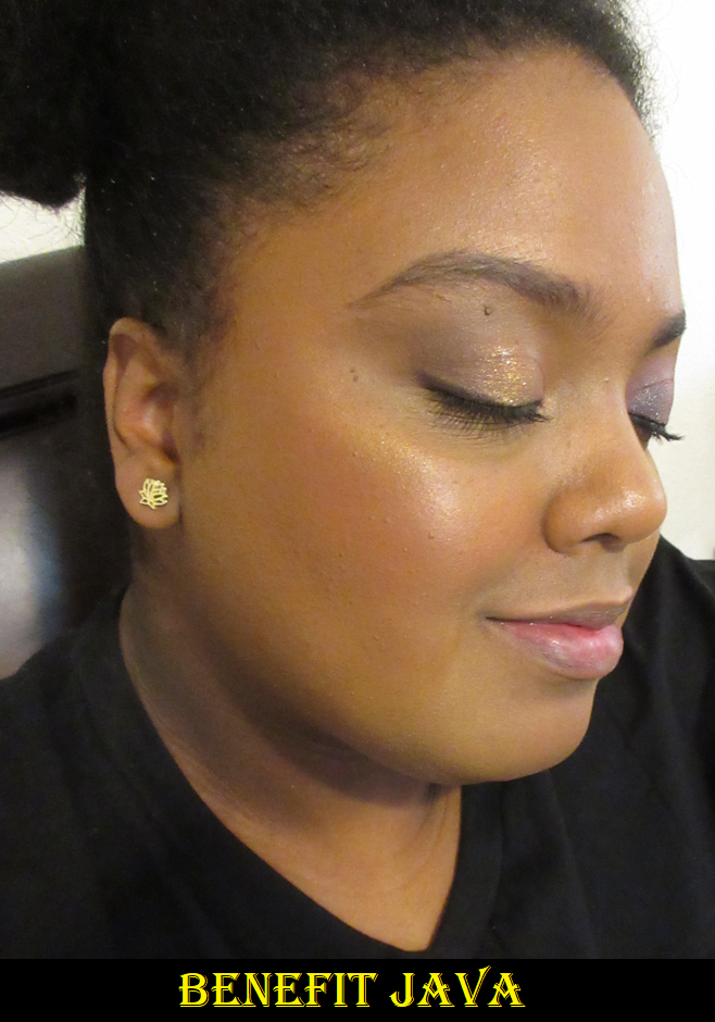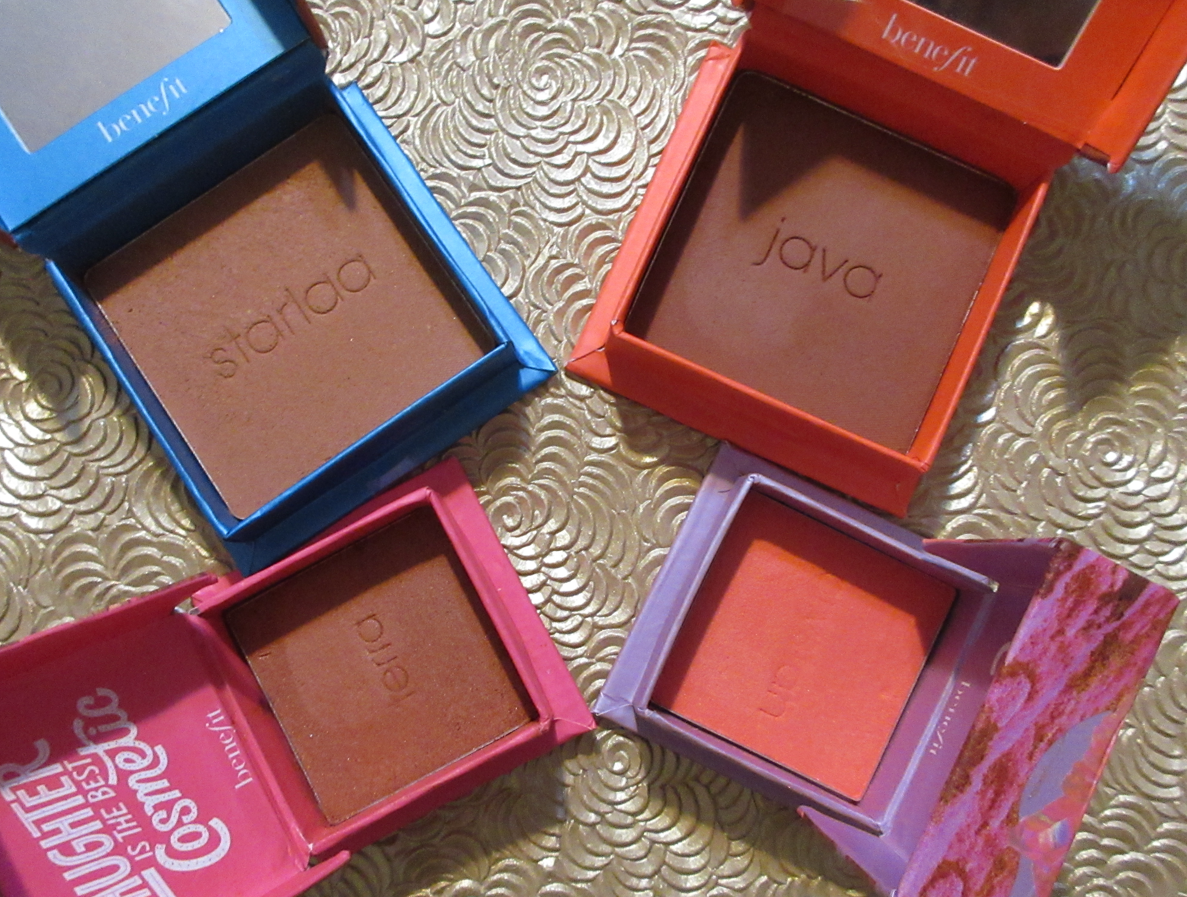 There are three different finishes among the permanent blushes: Crystah and Terra are shimmers, Starlaa is a satin, and Java is a matte. The shimmery affect in Terra is on the subtle side, though the base color is pigmented. I only need one dip in the pan to get the amount of blush I would normally want; two dips makes the blush prominent, but not garish. I would not exceed two dips into the pan with the brush. With Crystah, the gold shimmer is more abundant and brighter. It’s like Benefit’s version of Nars Orgasm X, but better in my eyes. One layer of blush is all I need to give me a vibrant flush of pink. I can see it straight on, but when I turn my head to the side, the gold reflects brightly and literally makes the pink less visible wherever the light is hitting it. So, at certain angles, it looks like I just have a golden cheek with the barest amount of pink tinge underneath. A lot of coral blushes with gold shimmer that I’ve used in the past have ended up looking silly on me because of the way light reflects off the shimmer, but in the case of Crystah, Benefit made the base color so pigmented that it still ends up looking pretty to me, especially since the shimmer is so fine in size. If I add a second layer, I can definitely see more of the pink color even when light hits it, but that means it’s also very intense when looking at it head on. I prefer to just stick to a light layer when using it alone, or it looks fantastic on top of Benefit’s blushes and as a topper for other blushes in my collection.