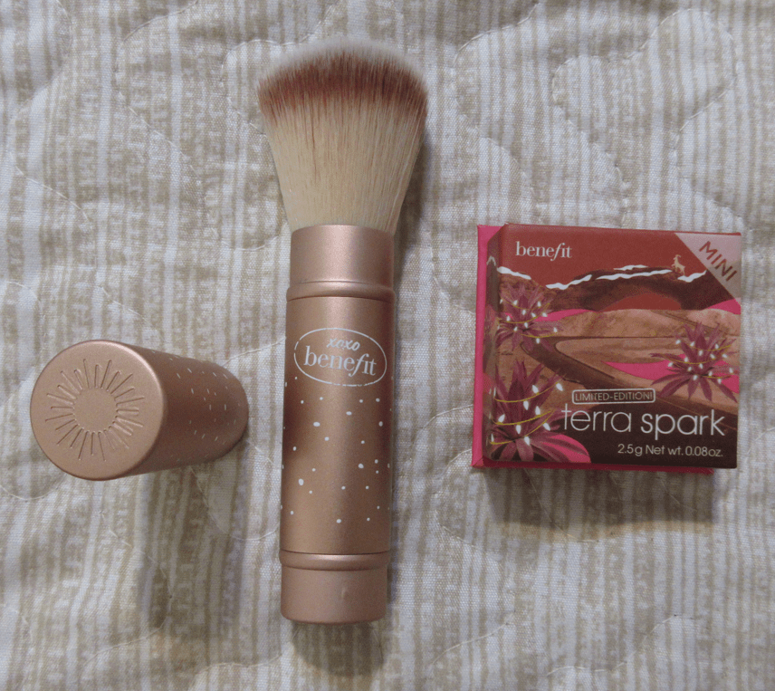 The holiday set called “Beauty Mail Blush n Brush gift set” (or “Blush ‘n Brush Delivery” later in the US), with the limited edition blush called Terra Spark, was also available in the UK first. I loved the original Terra blush, so I grew too impatient to wait for Terra Spark to come to the US and immediately ordered it from Selfridges. Imagine my surprise when I found out the shimmery red-gold blush I planned to use as a highlighter was basically Terra with a gold overspray!