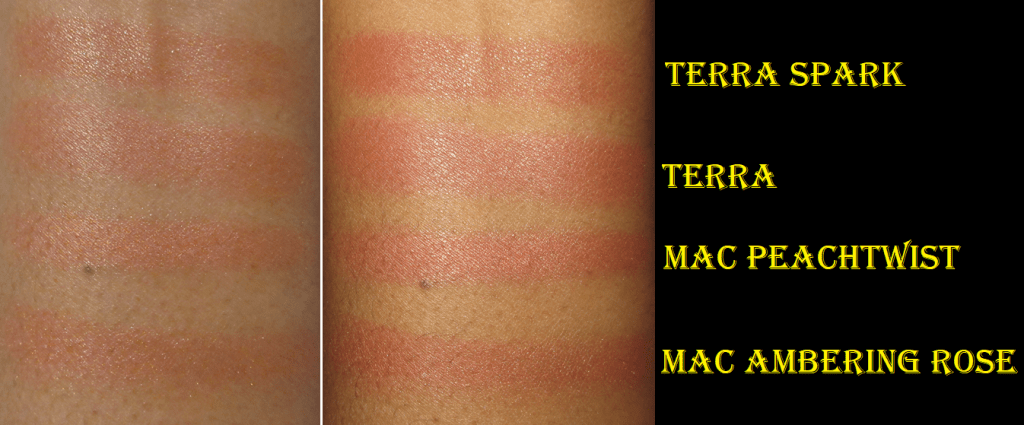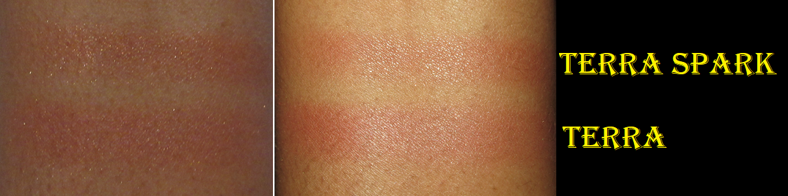Though they are technically different, I feel that the promo images for Terra Spark are misleading in representing how much of an impact the gold shimmer will have on the look of the blush.