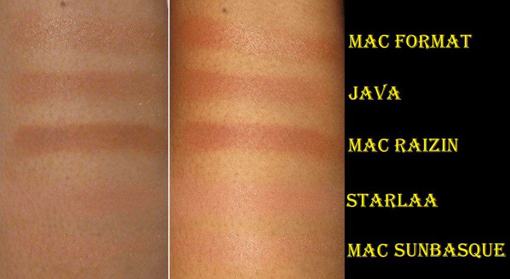 The closest dupe I have for Starlaa is MAC’s Sunbasque. I never use it because it’s too light for me to work as a blush. Starlaa is just barely dark enough with just enough of a deeper pink for it to show on my skin.