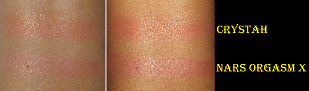 Swatching Crystah and Nars’ Orgasm X side by side, I now see why Crystah is a better fit for me. It’s more coral leaning in the base color rather than pink. With my undertone, I find corals to be more flattering.