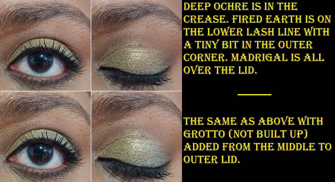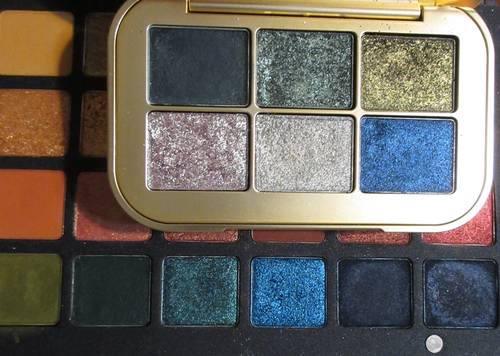 I understand that the inspiration for this palette was a peacock tail, and so the blue was necessary. The fact that Troubadour is a very blue leaning green helps to tie Swansong to this palette, but that makes both deepening shades in here blue. I found myself wishing I had either a dark brown to tie in with the greens and gold, or wishing for a true deep green. That’s why I ended up purchasing Deep Ochre and Fired Earth in the event that I wish to remove Swansong entirely.