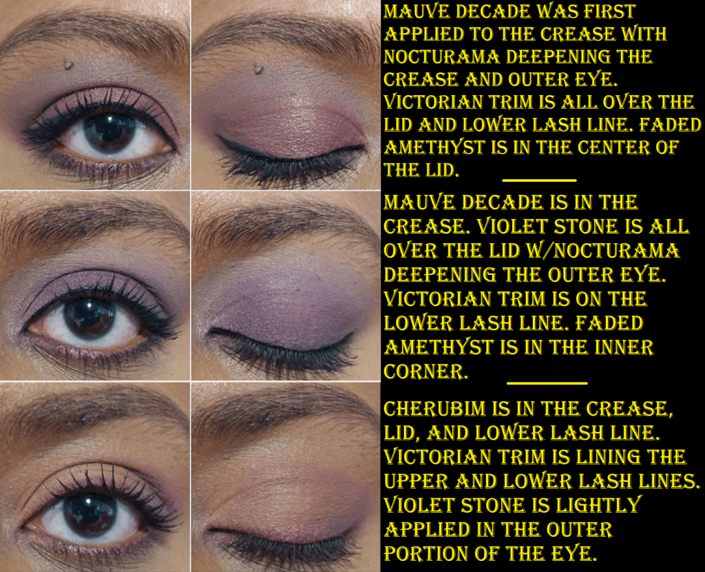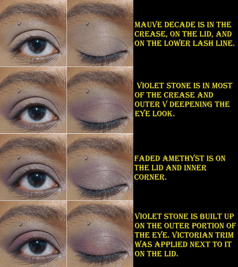 Since the Muse palette leans pink, the shades from there pair very well with the ones from Myth. So, I wanted to include an example of that in the final eye look above. Also, I wasn’t sure which section I should put this message in, but I wanted to warn about the reddish purple type of shades in this palette. I get teary eyes often and when I’ve worn the shades Vintage Mulberry and Victorian Trim, and had to wipe the corners of my eyes, the tears were pink. It happens every time my eyes decide to be watery. Those two shades basically run on me like non-waterproof mascara can. They haven’t hurt my eyes, but I just wanted to forewarn those in rainy climates or who have watery eyes like me that it could happen. I’ve continued to wear those two shades in my outer corner for depth, but I no longer put them on my lower lash line.