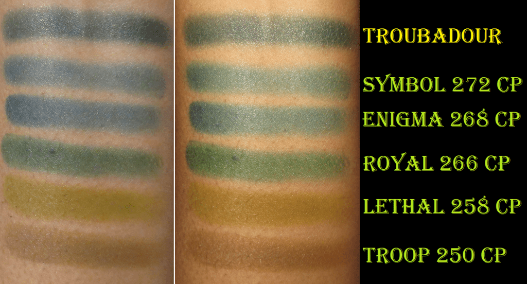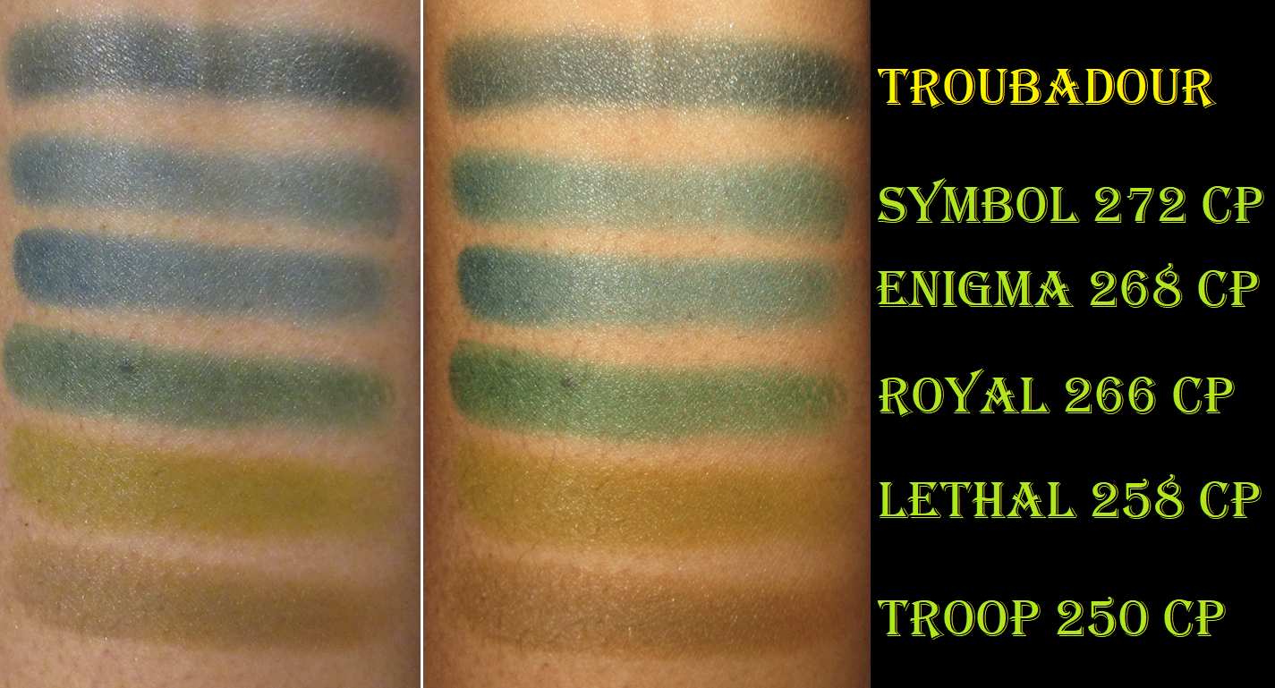 Troubadour, the “deep inky teal,” looks exactly like Symbol in the pan, but it’s much closer to looking like Enigma because it’s closer to blue than green. I would love for Lisa Eldridge to come out with a green like Royal. Actually, I’d love a dupe for Lethal and Troop too.