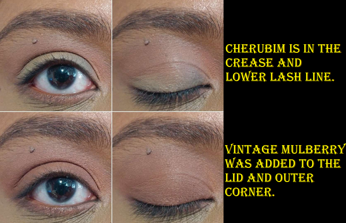 I didn’t buy these shades all in one order. I started with Cherubim first because I was in love with that color. Most pinks look lighter on my skin, and finding a light-medium pink that will show up looking like a soft pink and not ashy isn’t that easy for me to find. I also knew this was the shade I wanted to replace Illusionism with in the Myth palette. Then, because I wanted a shade to add depth without looking so dark and plum like Nocturama, I bought Vintage Mulberry. Vintage Mulberry ended up not looking as dark on my eyes as I expected, so it’s darker but not enough to add as much structure as I wanted. Considering it’s a Velvet, I’m still glad I got it. Then, I couldn’t decide which brown I wanted to use with the Sorcery palette that wasn’t cool-toned, so I added both Deep Ochre and Fired Earth to another order.