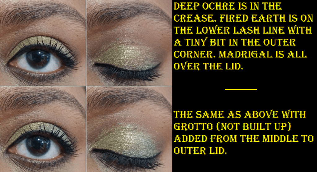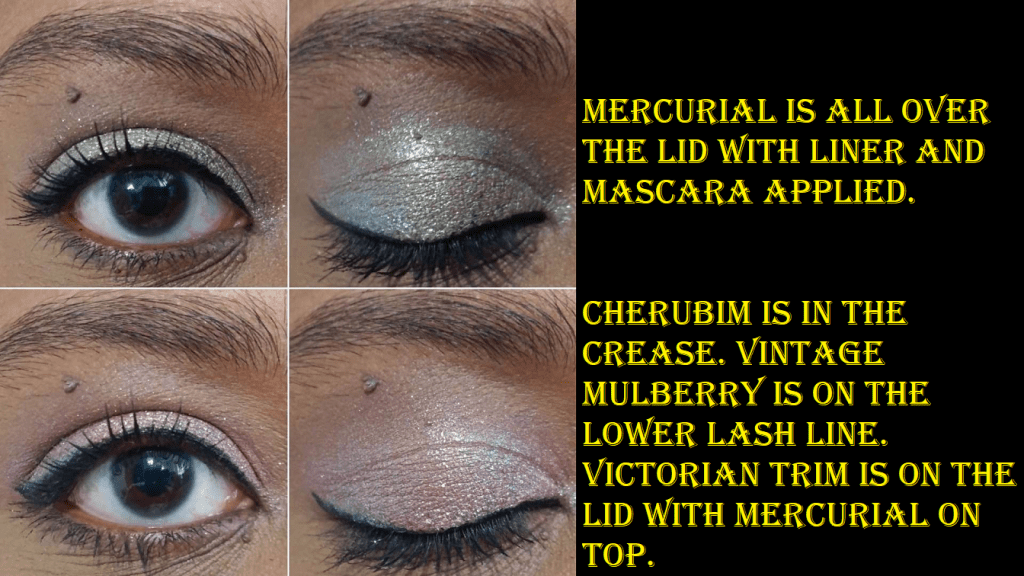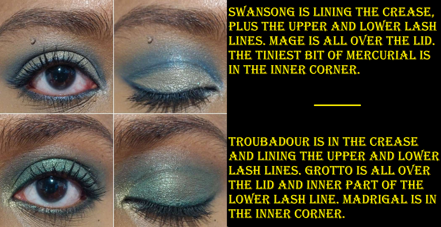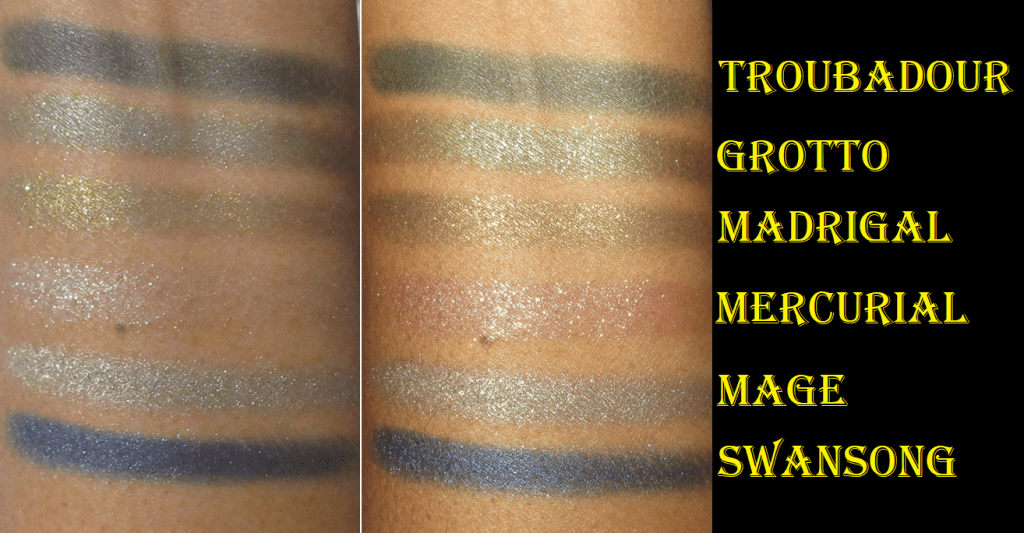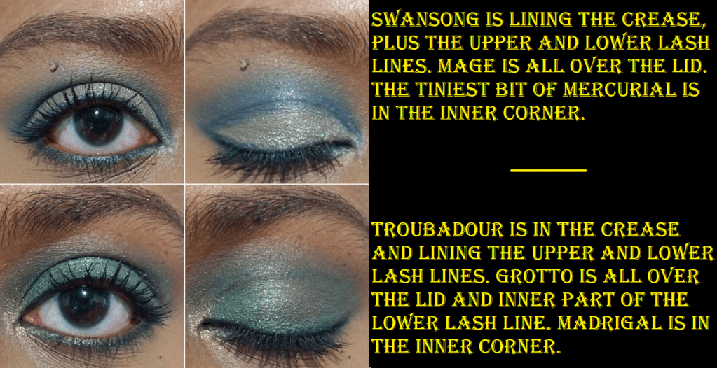 Since I purchased the brown shades, I wanted to show how I would likely use them with Sorcery. I then wanted Madrigal to look a little more green, so I added Grotto to one of the looks for a subtle tinge difference. Also, I didn’t feel that I showed off Mercurial enough, so I made sure to include an eye look using it by itself and then as a topper with other shades.