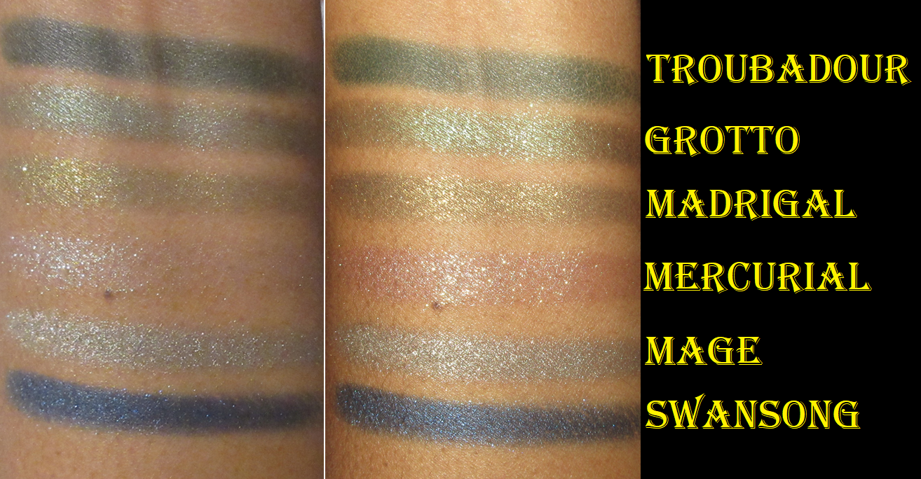 As a standalone palette though, Sorcery is fantastic and the one I recommend the most. Having such a special shade like Mercurial, plus a unique tone of gold in Madrigal, getting an uncommon (at least in my collection) color like Mage, and one of my favorite formulas in Troubadour makes this especially desirable out of the premade palette options from the brand.