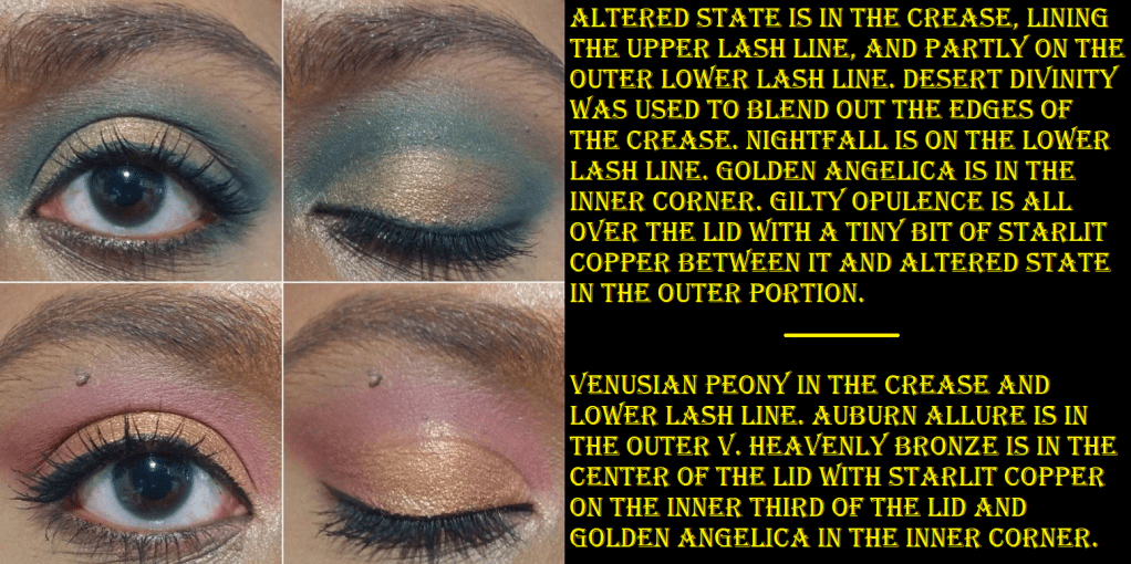 The majority of these shadows are extremely pigmented! I’ve gotten so used to creating eyeshadow looks with more softly pigmented shadows like the Lisa Eldridge Seamless Mattes and Velvets, Dior shadows, and Bobbi Brown Jadestone that I felt out of practice handling the level of pigmentation from every matte except Desert Divinity and Nightfall. I like that the brand gave softer options out of these shadows that perform like pressed pigments, but they’re almost too weak to hold their own in a palette with such bold other shades. Desert Divinity makes for a nice transition shadow, but it’s not the type that helps me blend the edges of the other colors very well. Nightfall is darker than Desert Divinity, but doesn’t give me as much depth in the outer corner as I prefer, which is why I have to lean on the brown tones within Auburn Allure to meet that line between the colorful red side and the slight lean towards brown. Auburn Allure is my best alternative if I don’t want to have to resort to the deeper yet more colorful options such as Nocturnal Navy or Violet Vixen. It was in times of searching for a neutral deepening option that I realized most of the shimmers are light and neutral (not my preference within a big palette) with Bronze Infatuation and Starlit Copper being the darkest ones that are medium depth level at best. Also, as dark as the mattes are, they deepen up even more on my eyes. Venusian Peony looks so light-medium pink in the pan, but turns medium-dark pink on my skin. The dark shades going darker (likely due to oily lids or too wet of a primer) isn’t as much of an issue for me as trying to keep the look light with the lighter shades, but it going darker than I expected.