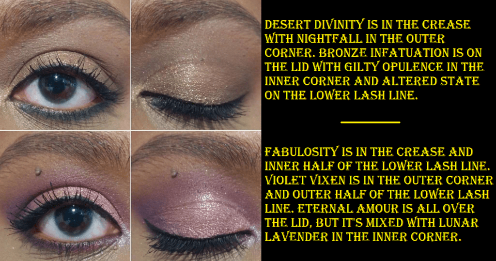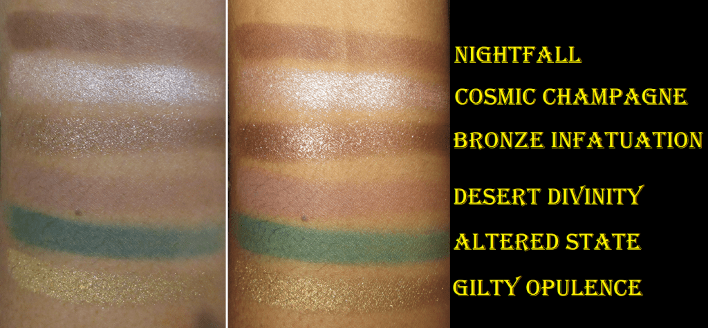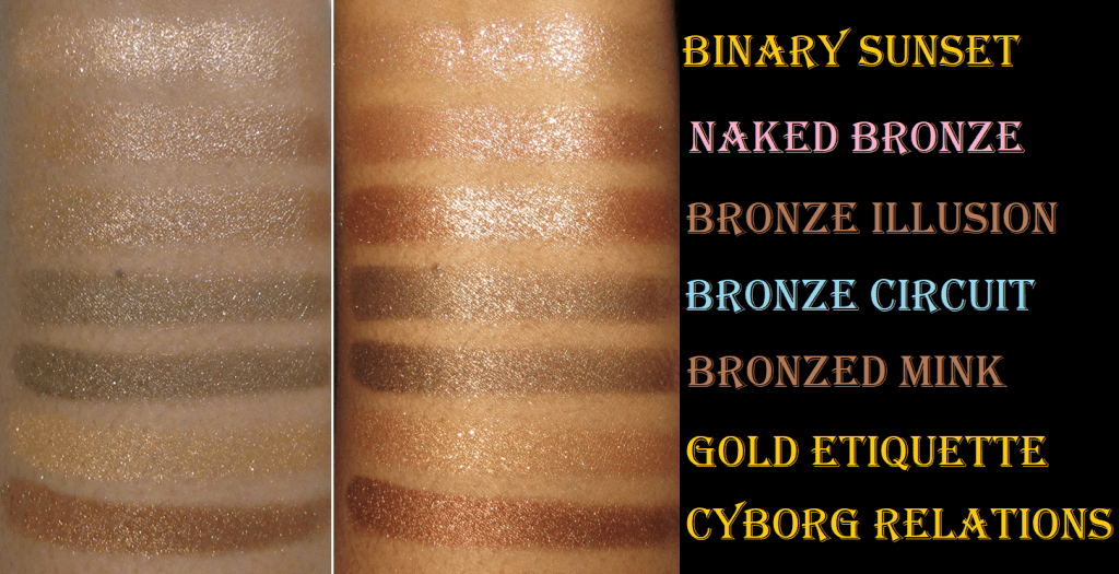 Binary Sunset is a little drier than the other shimmers whereas Cyborg Relations has extra slip to it, like Bronze Mink from Bronze Bliss. This palette isn’t as inspiring as Nude Allure or Bronze Bliss for me, but it has some great staple warm toned neutral options that will continue to benefit me as I use these palettes together.