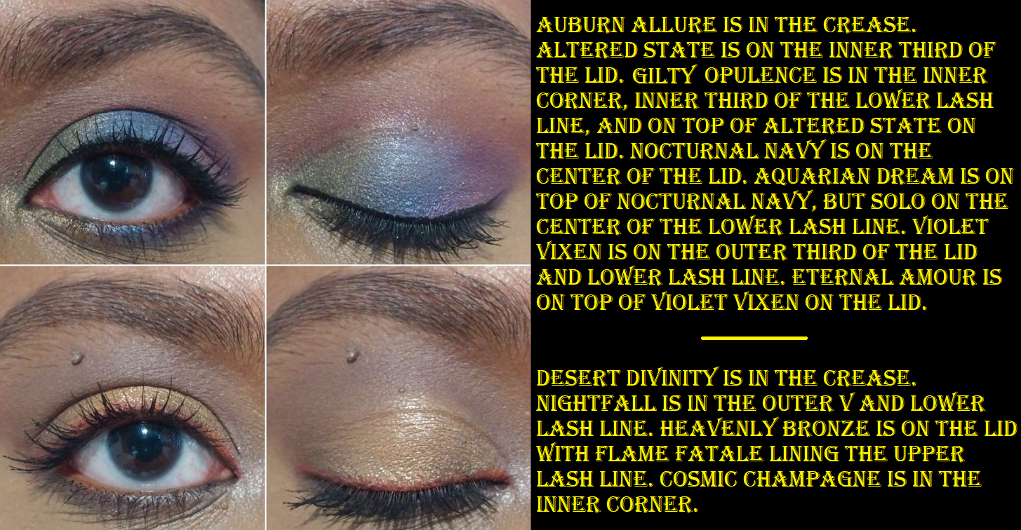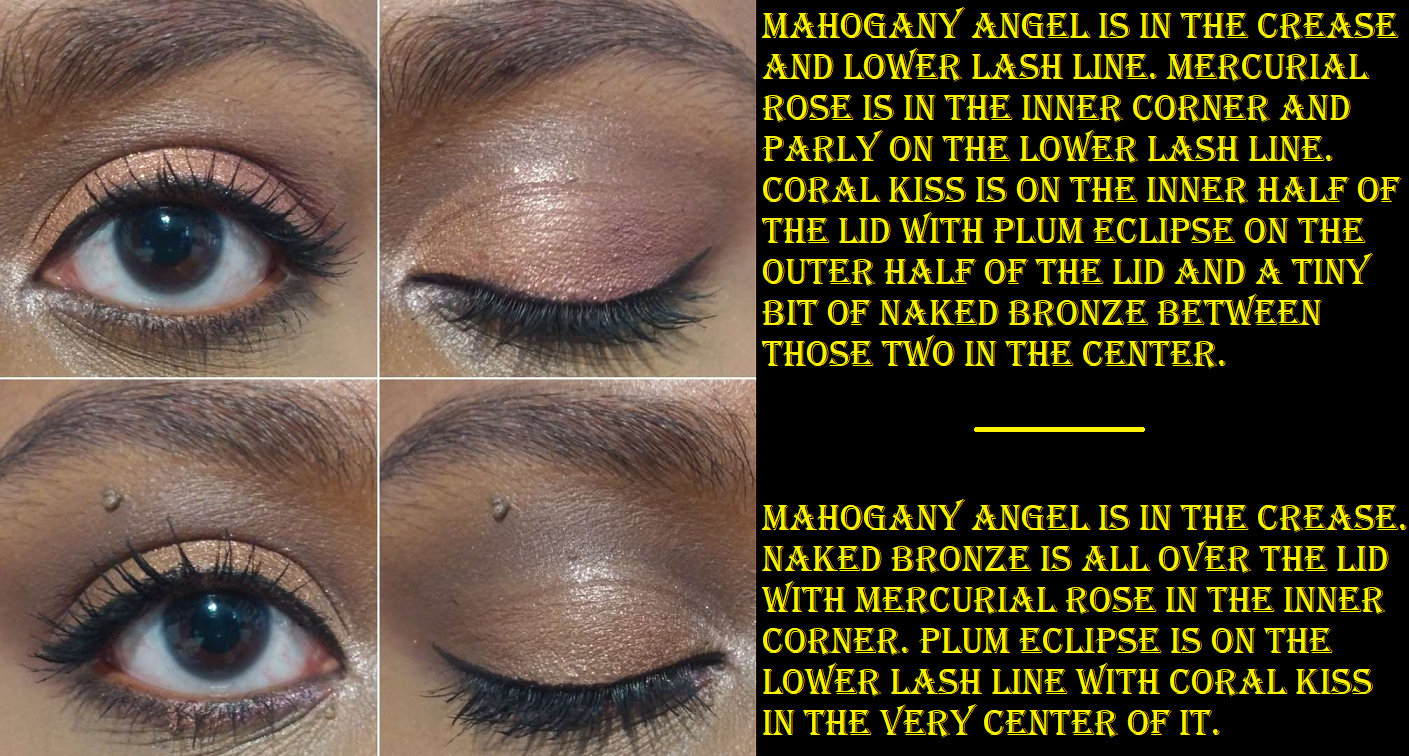 Coral Kiss and Mahogany Angel are the two main stars of this palette. Plum Eclipse comes in third, but it shares a similar issue with Ultraviolet Messenger from Divine Droid in that the gorgeous multi-colored sparkle doesn’t show as easily on the eyes. It still does a little and at least looks satin-like instead of matte, which is why I still like it. Coral Kiss doesn’t look as multi-colored as in the pan, but it does still look dynamic in person which is what counts the most to me. I love this shade and I love the first eye look demonstrated below. As for Mahogany Angel, it goes on the eyes darker than I expected, but I like that because I wanted a deepening shade that would work well with most eye looks. La Vie En Noir from Bronze Bliss has that blue leaning tinge that keeps me from using it as my deepening shade for most of my eye looks, though now that I think about it, it would probably pair well with the blue, purple, and green from Divine Droid.