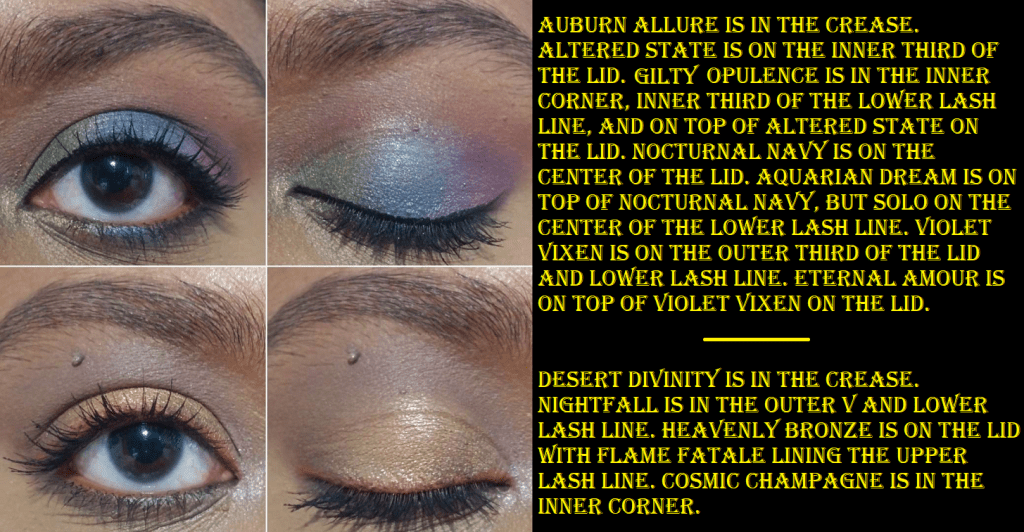 Also, I no longer have the PML Nocturnal Nirvana Quad, but the lime green, blue, and purple shades from Divine Droid reminded me of that one. Sure enough, Dr. Ash on YouTube had the same thoughts and held them side by side in her video. Of course, the green in that palette is more multi-dimensional than this one. I don’t care for either blue shadow. As much as I was disappointed by Ultraviolet Messenger, it is easier to work with it than the purple in Nocturnal Nirvana. I sold that quad (and replaced it with the Interstellar Icon quad) purely because I wasn’t getting enough use out of it, and not because I disliked the shades. I’ve thought about that quad several times since it left my possession, so I don’t mind having something similar back in the form of Divine Droid.