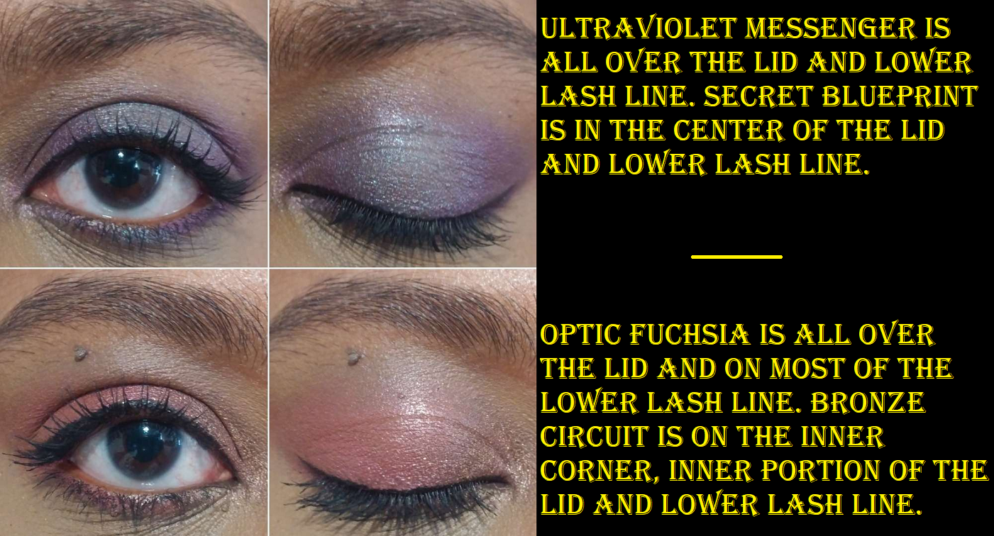 Even though I wanted a little more from the first four shades, the true disappointment is Ultraviolet Messenger because it doesn’t blend as well and there’s barely any visible shine when it’s on the skin. By not blending well, I mean that it goes on harsh no matter how little product I use, so it requires blending, but it diffuses so easily that the magenta tone in the base starts to appear, which makes it look splotchy compared to the darker purple. I have to be extremely careful when blending it out and packing the color back on in places. It’s not so bad when I use Optic Fuchsia with it because the magenta just looks like an extension of that shade, but it’s more of an issue when I’m trying to use Ultraviolet Messenger right next to the green or blue. And despite being applied with a finger or wet, the shine doesn’t stay. It looks dull and matte on the eyes. This might make some people happy, considering we don’t have a matte in this palette and this shade could act as one or might just stay in the outer corner as a deepening shade only, but the part that made me the most excited for that purple was because it looked the most multi-colored in the pan. I wish that translated to the eyes.