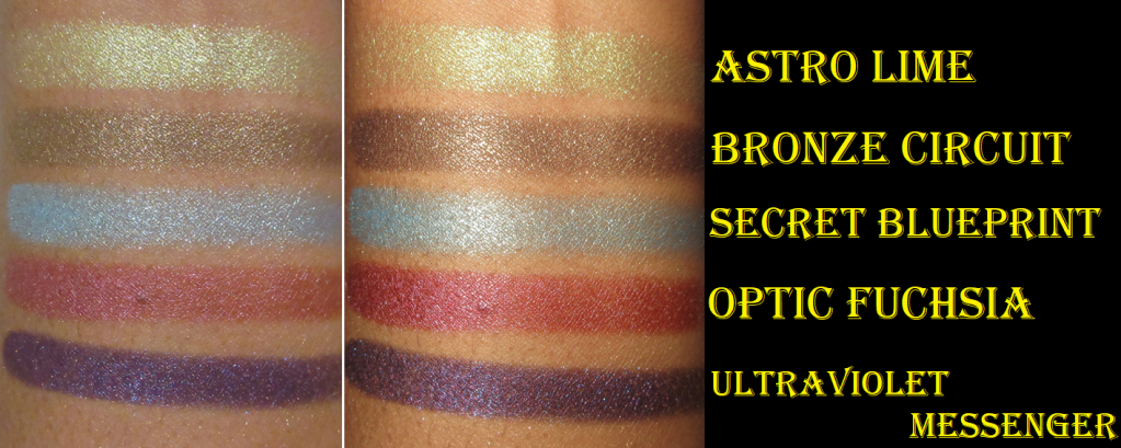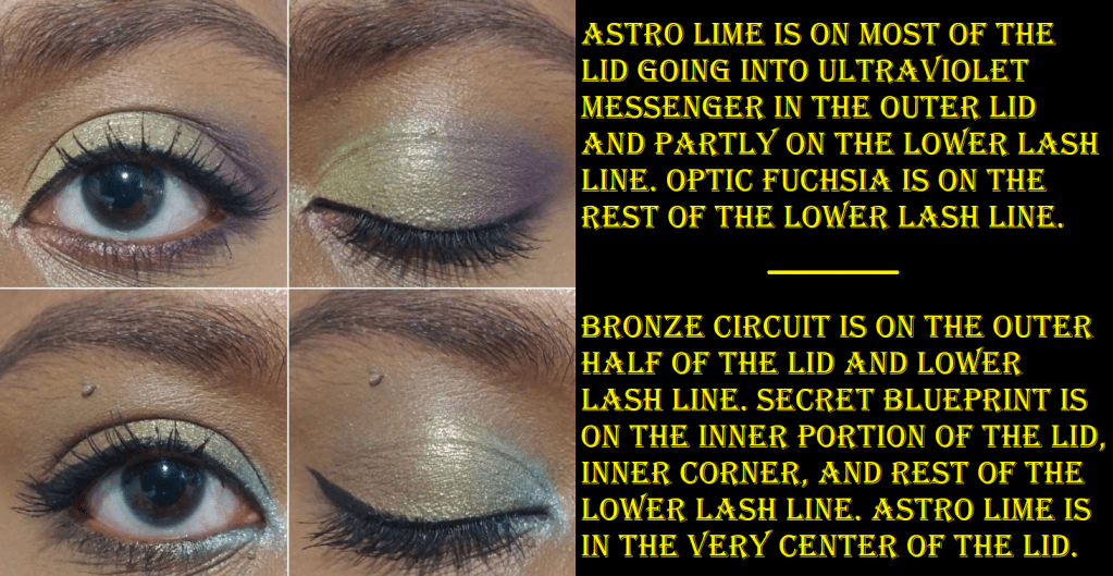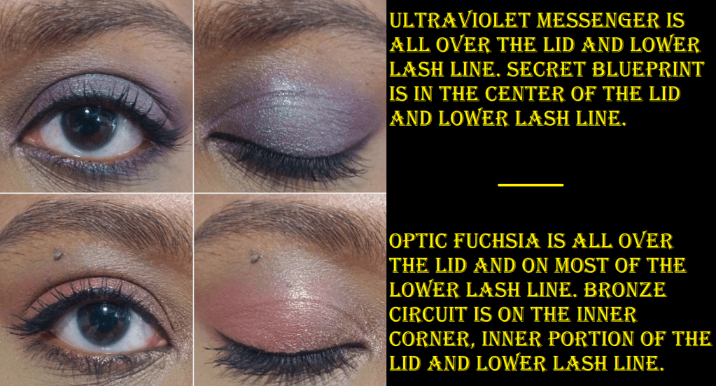 Starting with the only palette that slightly disappointed me, Divine Droid, I can at least say the colors are beautiful. They look like they’re going to be as sparkly as the others in the pans, but Astro Lime, Optic Fuchsia, and Ultraviolet Messenger look slightly duller by comparisons on the eyes. Out of the reviews I’ve seen so far, I’ve observed that the highest praises for this specific palette come from Influencers that tend to wear mostly neutrals, and the strongest opinions against the palette are from Influencers who are used to indie brands’ shimmers and those who love truly vibrant colorful glittery shadows. These shades are bold and they are shimmery, but I think it comes down to the nature of colored shimmer versus reflective metallic sparkle that the colorful shades don’t have as much of as the others. The only other way I can think to explain it is that satins are shiny from a sheen and tiny shimmer particles, and Divine Droid eyeshadows look just like that, except that these shimmer particles are more apparent and textured. The shine level is the equivalent of an amped up satin. Secret Blueprint is an exception because there’s a lot of whitish-silvery sparkle, but I don’t like light blue shades and only use them when the look can benefit from having one. To get Secret Blueprint to stay bright on the eyes, I have to apply it damp. Bronze Circuit has some golden sparkle, but the color itself is less olive in person than I hoped. It’s still a pretty antique bronze-gold with a slight green tinge, but the shade doesn’t go far enough in the direction of green to be that unique.