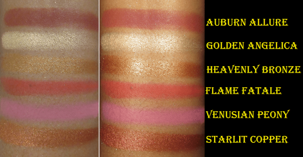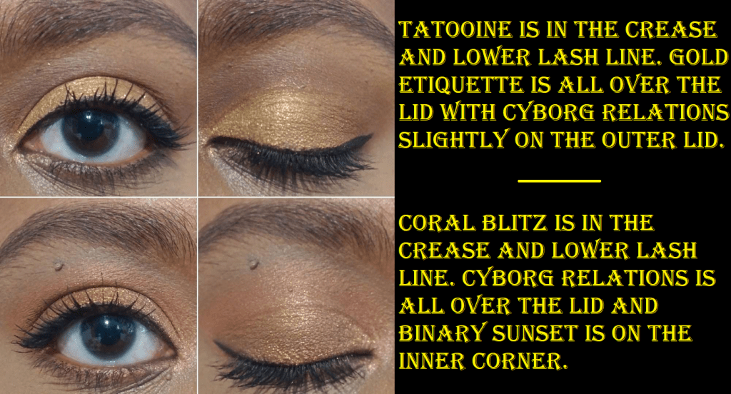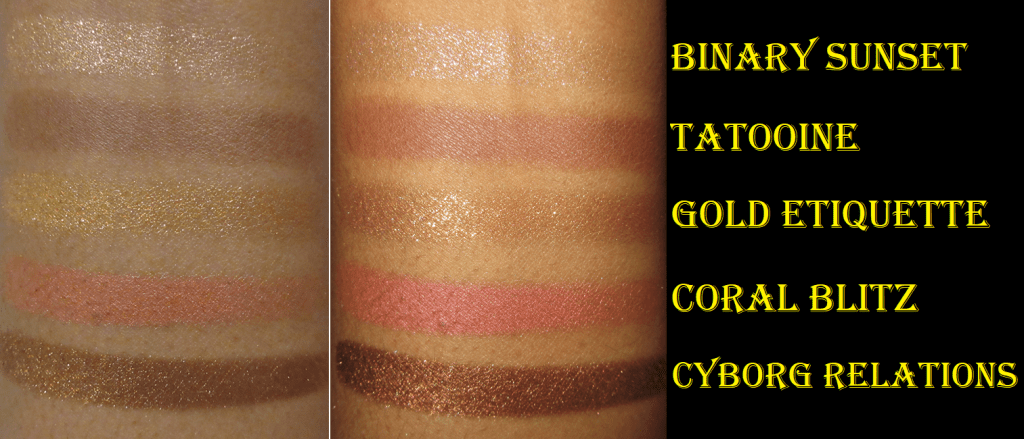 If I had to rank these from most liked to alright/fine, it would be: Bronze Bliss, Nude Allure, The Golden One, and Divine Droid. Bronze Bliss easily wins because it has the most of those metallic type shimmers which are what’s special about this new formula from the brand, in addition to the matte. Nude Allure comes second because of Coral Kiss and having an even more useful matte. The Golden One has the very special Coral Blitz, plus a matte, plus the gorgeous Cyborg Relations, but it is the least inspiring color story together in one palette which is what knocks it down from what could have been the second spot. Divine Droid is last because of there being no mattes, less reflective shimmer, and the stubborn purple.