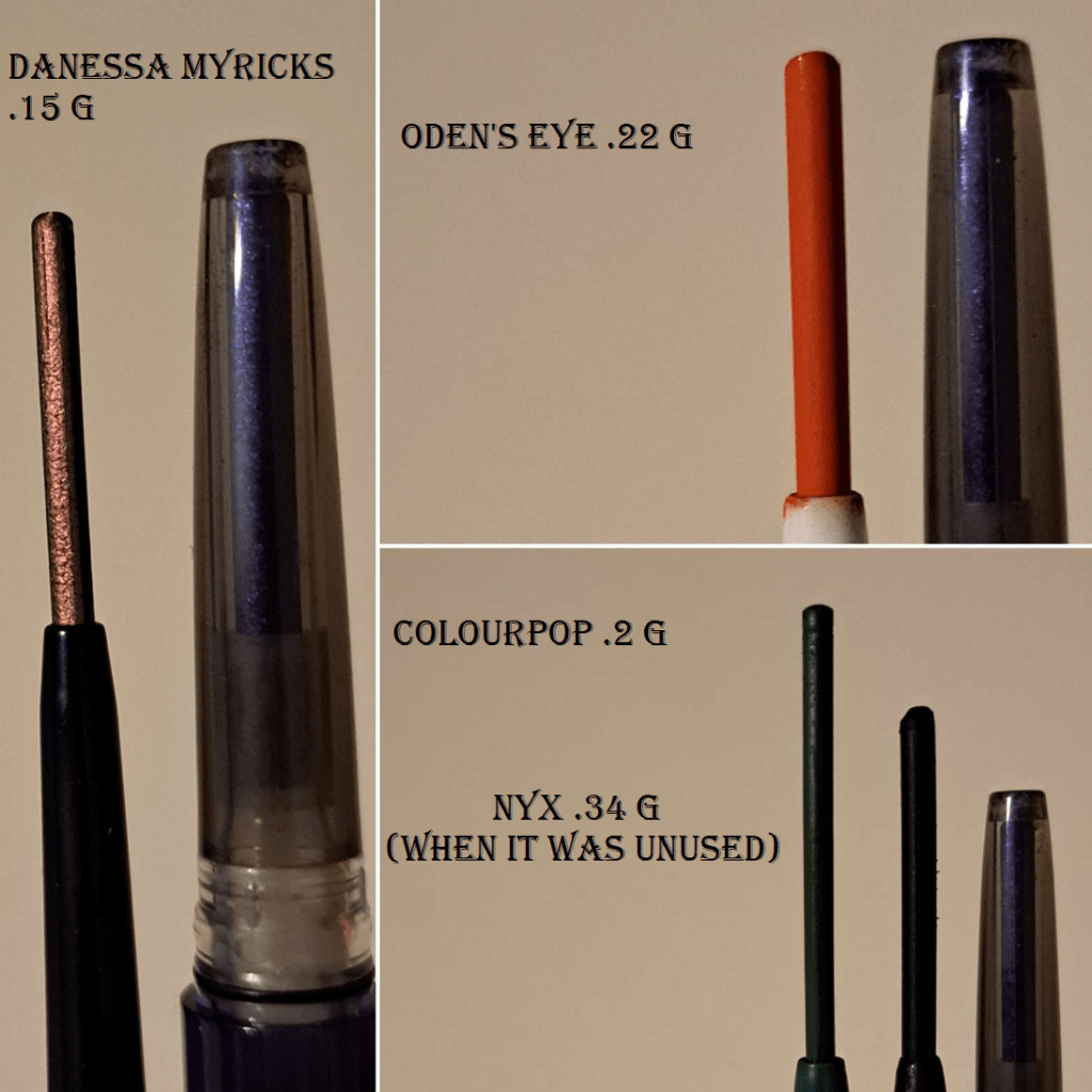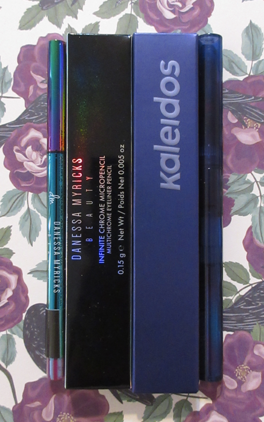 One advantage the Danessa Myricks pencil has over the one from Kaleidos is how thin it is, which makes it so much easier for me to use precisely. I know a big complaint from customers about it is how little product one gets in the Chrome Micropencils, but as someone who normally takes six months to use up a black eyeliner, even if it was in almost every eye look for those six months, a product like this one that I’m going to use a lot less frequently should last me ages. Kaleidos has 0.20 grams compared to Danessa’s 0.15 grams, so I’m fine with that difference. Some brands give a ton of product, but among the micro pencil category, the Hourglass 1.5MM Mechanical Gel Eye Liner is 0.06 grams and the Shiseido MicroLiner Ink Eyeliner is 0.08 grams, so those have even less for around the same price and they’re not multichromes.