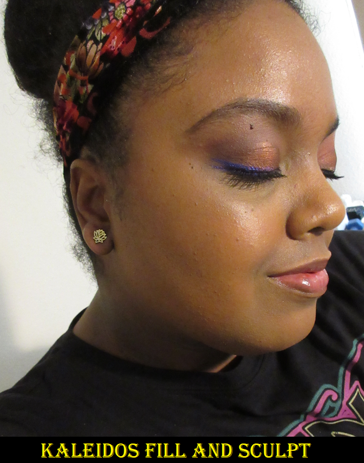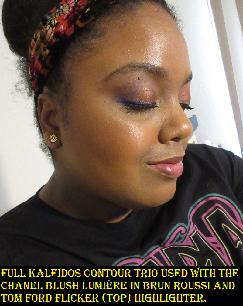 I’ve been using the Symphony Contour Trio quite a lot since it arrived. The powders feel super soft to the touch and remind me of the Hourglass Ambient Lighting and Laura Mercier Candleglow Perfecting powders, put more heavily pigmented. The fill shade is supposed to be the illuminator that, “delivers soft, from-within radiance with buttery smooth powder that expertly blurs skin textures and naturally brightens targeted areas.” I’m a bit confused that this is considered a glow product when I am unable to see any shimmer or sheen to the powder whatsoever. The only glow I get is from my foundation. The powder imparts a natural finish at best, which is why I feel so comfortable using it to set my under eyes. Kaleidos also sells the “fill” compacts separately and I was considering getting a lighter shade since this just sets things in place and doesn’t deliver on the brightening effect (possibly due to the color depth), but I’m not sure if the Tan version would be too light for me. Had this product been less of a setting powder and more of a finishing one with shimmer or a sheen like the Guerlain meteorites, I’d have been willing to give another shade a try. But I only need it for setting and am perfectly happy to have this one for that purpose. That also being said, kudos to Kaleidos for the fact that all my comparisons to this product are high end brands because that’s the quality level of this product and for a really great price!