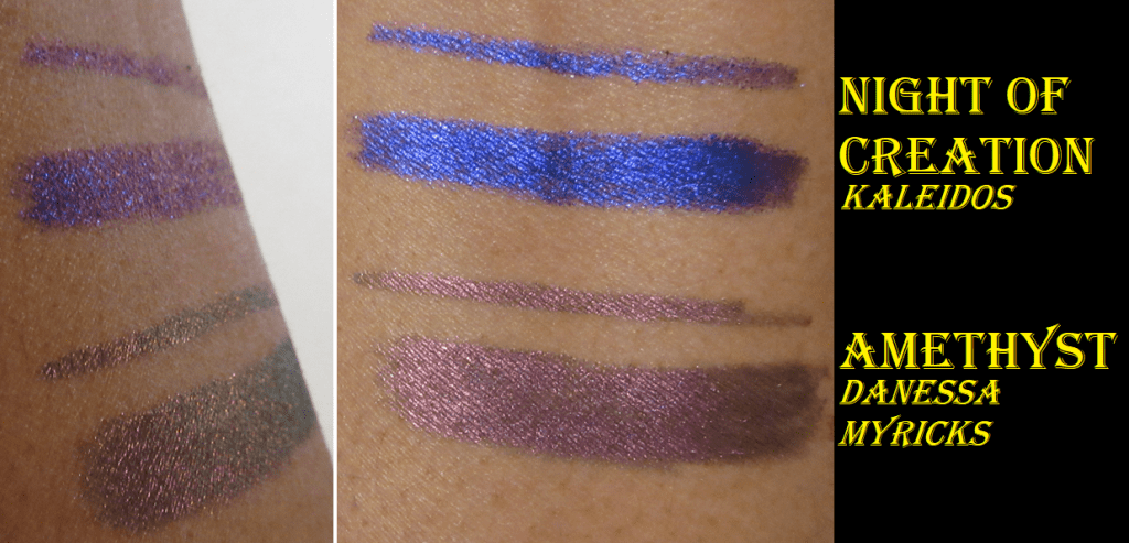 These are also both waterproof. I do not recommend trying this on without a waterproof makeup remover or an oil of some kind to help break it down because these are truly waterproof, especially the one from Kaleidos. Most of the time when a product is waterproof I can still remove it from my skin with Bioderma, but neither of these budged at all when I made multiple passes over my swatches with Bioderma and my Makeup Eraser cloth. I then used regular hand soap and water, which only the tiniest bit of the Danessa Myricks came off at. I then used Dr. Bronner’s Pure-Castile Liquid Soap that contains oil in it and that removed about half of the Kaleidos and most of the Danessa Myricks. Ultimately, I still pulled out my Sephora Waterproof Eye Makeup Remover which did the trick but was still not a breeze to do like I expected. So these are no joke!