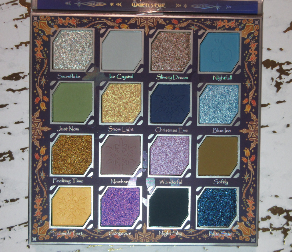 I bought both the Christmas Eve and Merry Christmas Palettes from Oden’s Eye and received two free ornament keychains with my purchase. I was very easily drawn to the Merry Christmas palette because of the greens and how on theme that color scheme is, but the Christmas Eve palette wouldn’t leave my mind. There was something so intriguing about the non-blue shades. I’m still in anti-blue mode, but I can feel that start to dissipate for now. At the time, I still felt it was worth getting the palette for all the other colors. That turned out to be a great decision because it was even more gorgeous in person and Oden’s Eye did not end up restocking these two despite the pleas from customers who I still see three months later asking for a restock on social media.