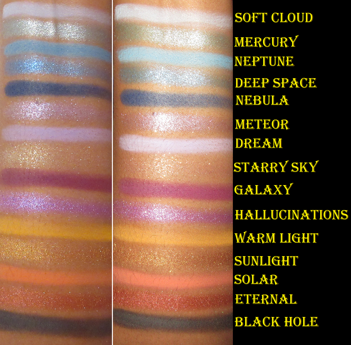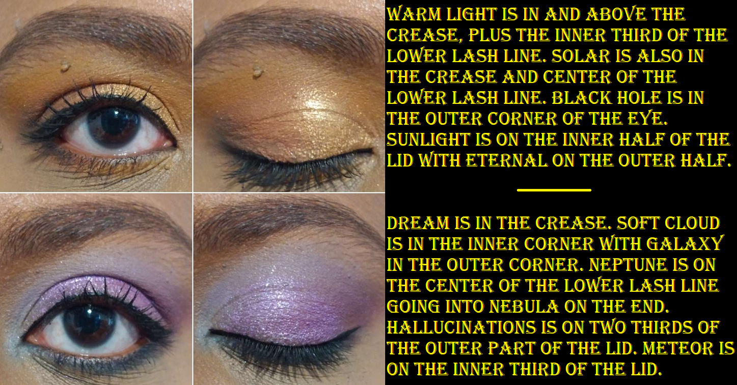 Galaxy was also not the easiest to use either, similar to Orchid from the Flora story palette. However, I was in a rush doing that eye look, so I’m going to give that one another shot in the future. Meteor is more like a topper shadow, but still pretty. I could have used it on its own and been happy with the look, but it also worked to intensify the shine level on top of Hallucinations.