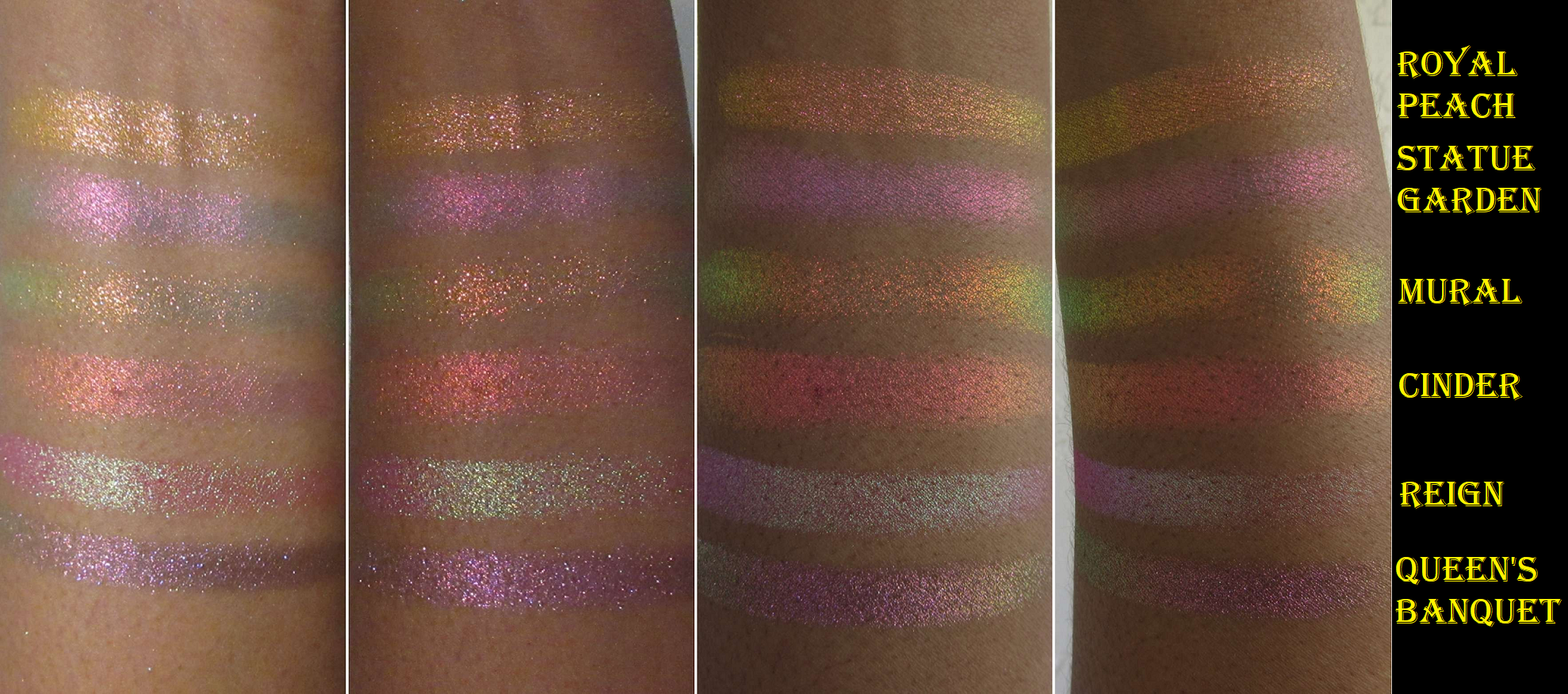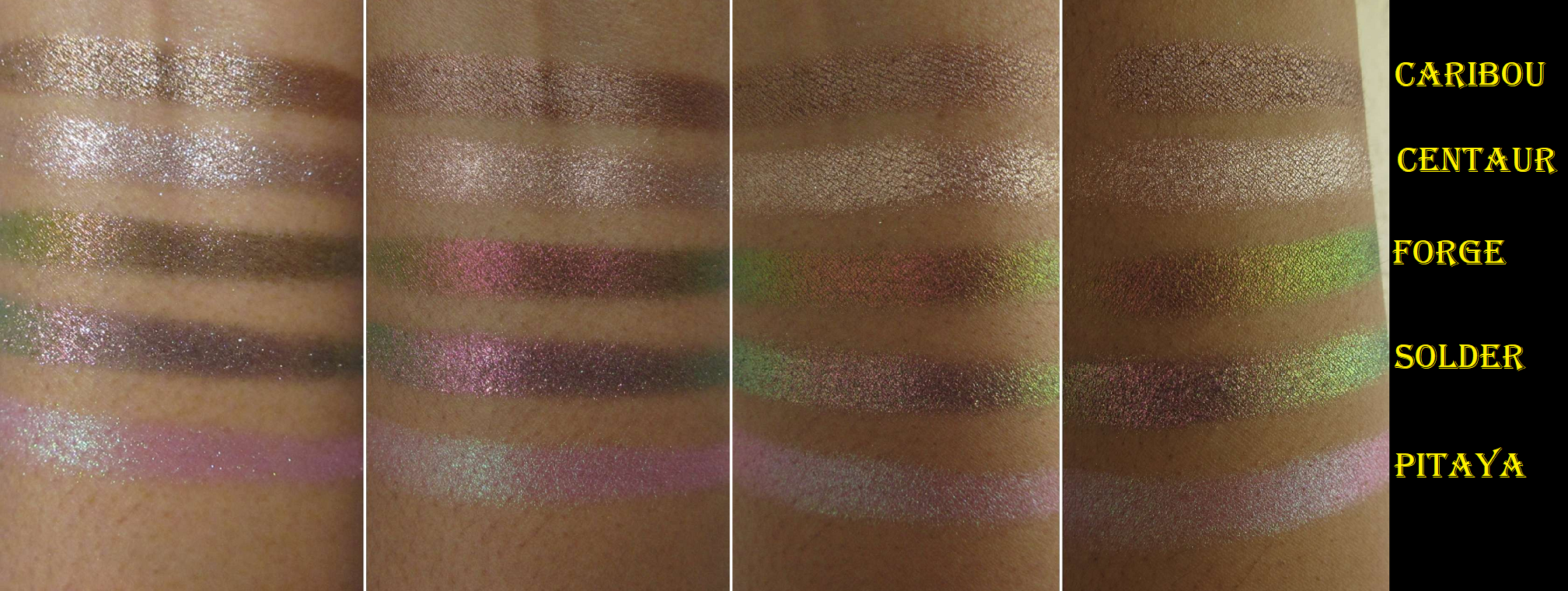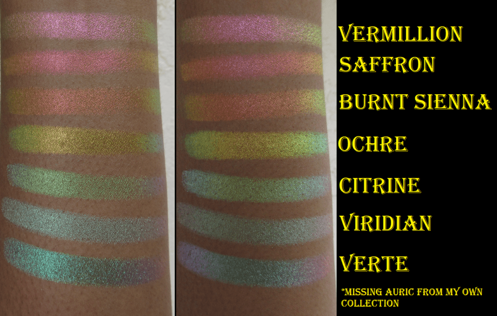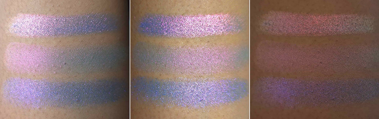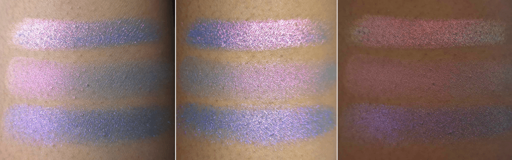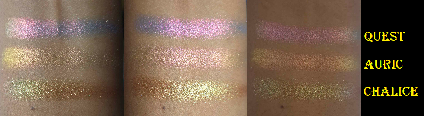 I’m also adding photos of the newest circle pan eyeshadows I’ve purchased as well! Plus, I finally got the other multichrome highlighter from the Dragonfruit Collection. The most I’m missing* are arm swatches of Quest, Auric, and Chalice. I at least have eye swatches of the latter two and video clips of all three.