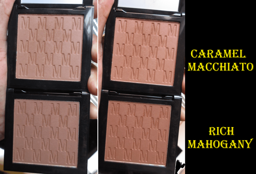 In the photo above, Caramel Macchiato is on the top left and right with Rich Mahogany on the bottom left and right. The left half of the picture shows how they look in the pan, while the right half shows a more accurate representation of how the colors will look on the skin. I took these photos in the same spot but slightly different angles and the amount of light I got from the window was able to show these drastic differences in the way they look. I believe I accurately captured all swatches though.