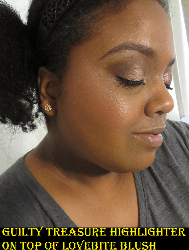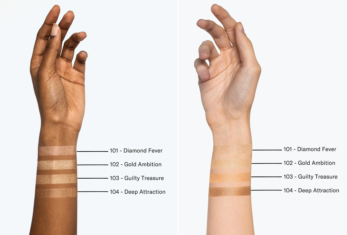Mesauda has several different forms of highlighter: liquid, baked, gel-powder, and cream-powder. Since my favorites tend to be gel-powder, I naturally chose to order this Lust For Shine formula. The texture is thinner and drier than I expected. The shimmer looks fairly smooth on the skin with its small particle size, while still being reflective. I consider the highlight intensity level to be a buildable medium, though it stands out even more on my skin tone because Guilty Treasure is on the lighter side of workable for me. I only brought highlighters with the same depth as my skin tone on the trip because I thought I would only want my highlight to look subtle, but I ended up still missing having that extra “pop” in my makeup looks. So, I bought this lighter shade out of fear that Deep Attraction might be my skin tone or deeper, which would have defeated the purpose of trying to buy a shade that differed from what I had with me. What helps Guilty Treasure to work on my skin tone is how sheer the formula is in allowing my skin tone to show through, which minimizes the cast I could have gotten if it had a base color as light as the shimmer.