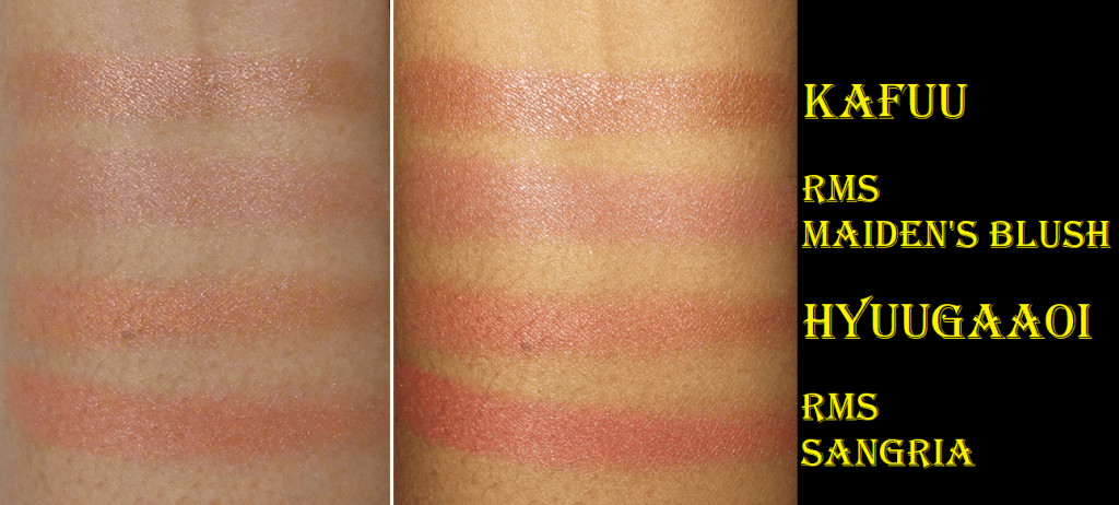 These have more in common with the BareMinerals Blonzers, which are holy grail blushes in my collection. The shade Hyuugaaoi is like if Kiss of Copper and Kiss of Rose were mixed together. The BareMinerals Blonzers are actually more reflective, but have a more pigmented base and the original three are smoother as well. So, not only do I like them even more on my skin than the ones from Suqqu, they also show up easier on camera no matter the lighting situation.