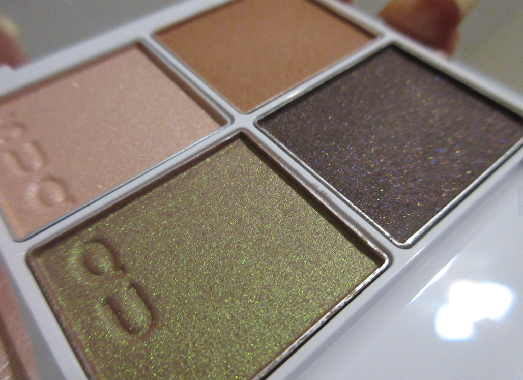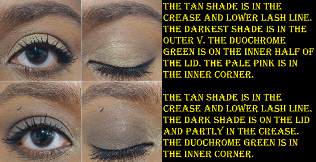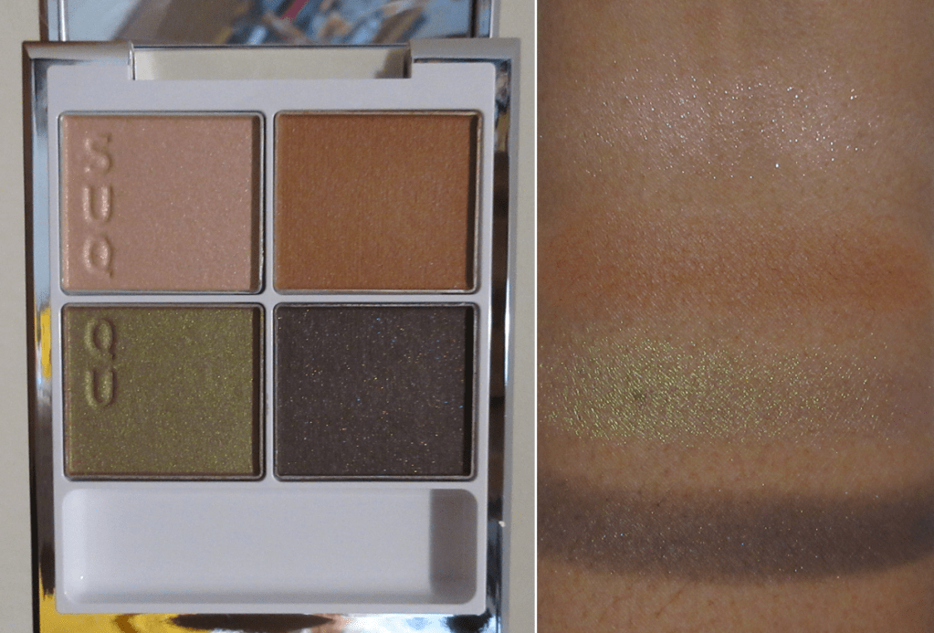 The duochrome in the bottom left of the compact is the main reason I wanted this palette. It looked different from duochromes in my collection, I also wanted the packaging, and I didn’t mind having that dark shade as well. The eye looks on everyone I saw long after the launch is what made me decide to pick it up weeks later. Unfortunately the top left topper shade does hardly anything for me. It took ages to build up that shade in the inner corner of my eye, even after wetting the brush. It’s meant more for scattered effect looks. I depotted that and swapped it for a different Suqqu shadow (as seen once again in the group product photo in the beginning). The tan brown is pretty much my eyelid color. I can use it to blend out the darker shades and set my eye primer, but that’s about it. The dark color doesn’t stick well to my eyes. When I used it solo on my lids, I kept getting a bald spot where it just refused to stay looking opaque. It’s just a bit too sheer. It’s hard to use it in the outer corner as well because it fades away when I blend too much. The green duochrome is more subtle than I’d like, but it’s pretty. It’s still the star of the show. Overall though, this color story just isn’t meant for someone of my skin tone. In at least swapping out the pale shimmer pink, I’m able to create looks I like more. And I know not to use the dark shade except in the outer corner and when I don’t mind it fading. Which means I’m likely only going to use it to take quick photos or solely reach for this quad for the green shade.