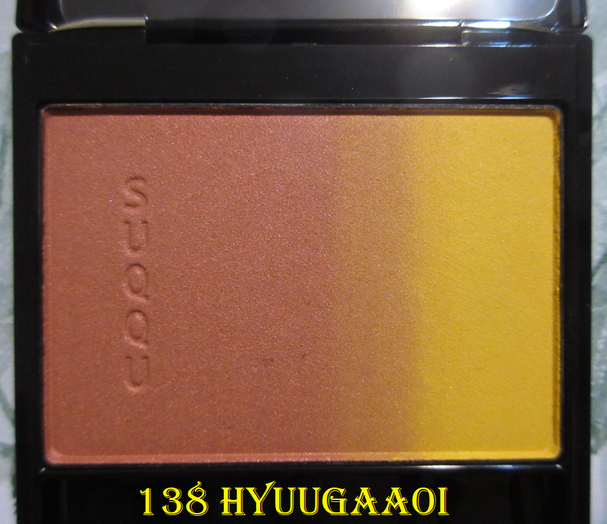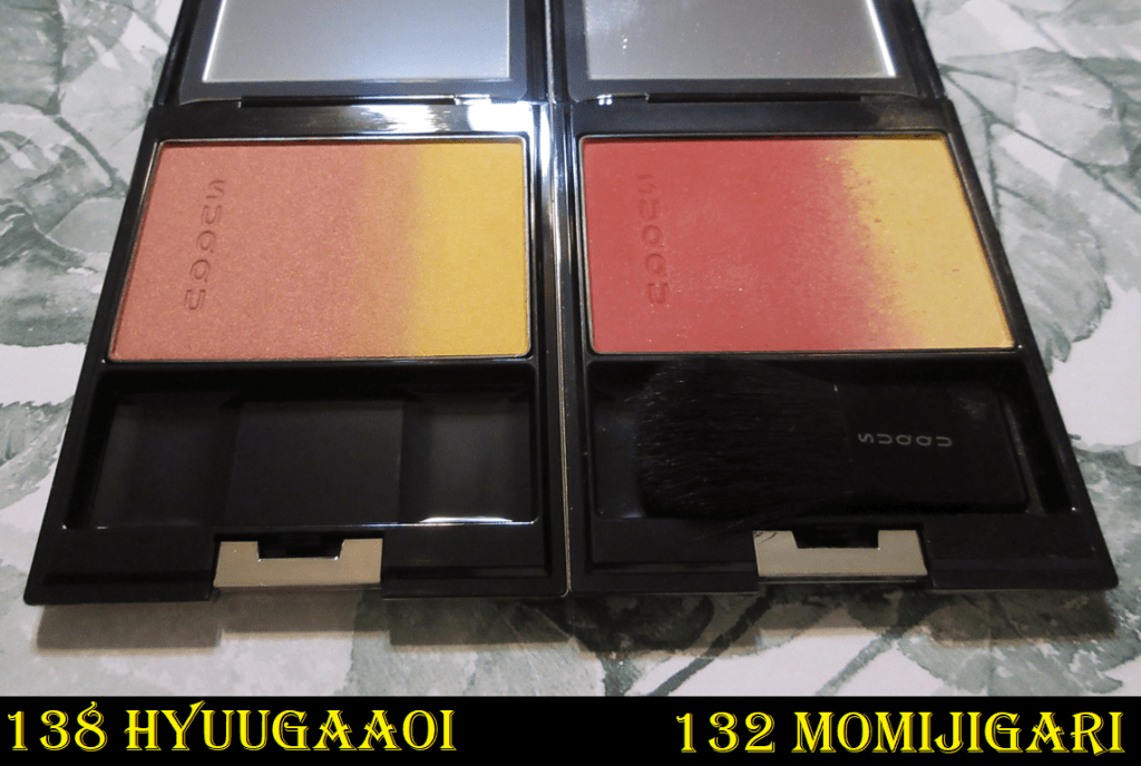 I was reluctant to purchase Hyuugaaoi out of fear it would be too similar to 132 Momijigari from last year’s fall collection, but they are definitely not the same. In fact, it’s a bit in reverse that Hyuugaaoi has a shimmery blush with a matte yellow strip, whereas Momijigari has a deeper, more vibrant and matte red blush with a shimmery yellow strip.