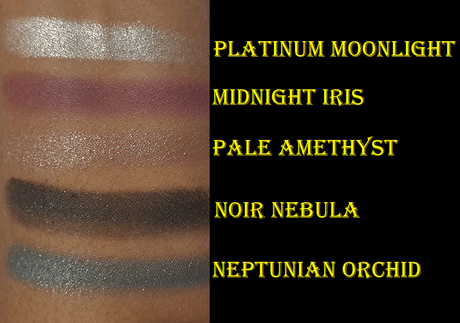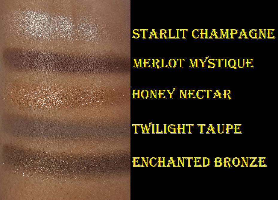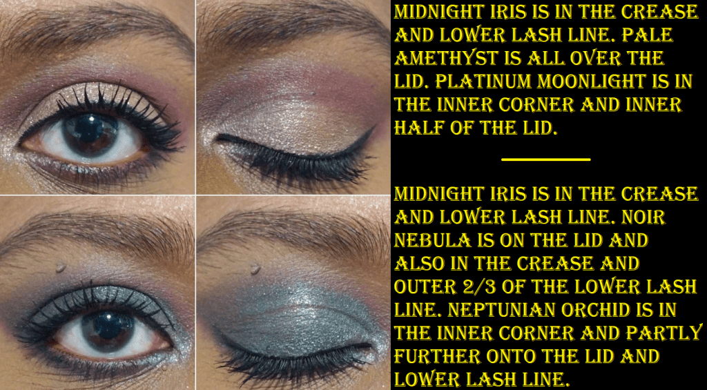 The quality of these are just what I would expect from the brand. The satins are stunning, the shimmers are beautiful, these are pigmented yet easy to blend, and among the shimmers there are various textures. The shades in the middle of both palettes are the wettest to the touch. As for Enchanted Bronze and Noir Nebula, they both have this very strange texture that smooths onto the lids nicely, and the base color is opaque, but the sparkles within those two are larger in particle size and not all that tightly grouped together. It nearly gives a scattered effect on the eye. Those two are also easier to get sparkle fallout, so I apply them precisely and carefully as the last step of the eye looks. I also tend to wet my brush since it makes me feel like they stick better that way, though it might not be necessary. My technique with those less easy shimmers is to apply them with my finger first, dampen a brush to pack on another layer to get the amount of sparkles I want, and then add one more final layer with my finger.