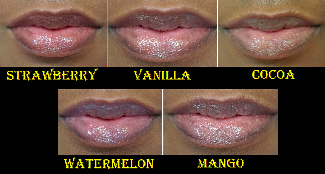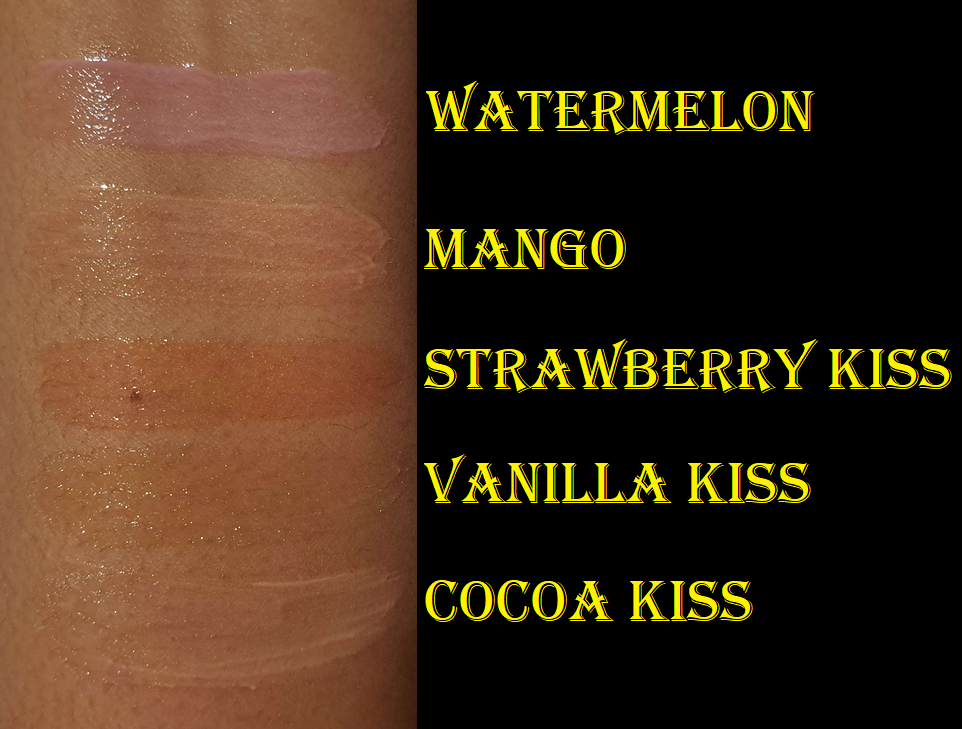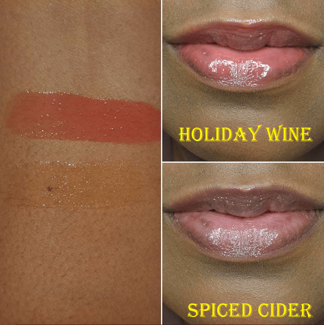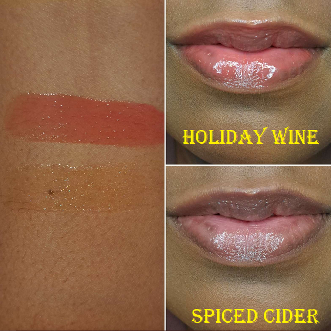 Holiday Wine smells like a cherry and strawberry forward sangria and Spiced Cider does have that spiced cinnamon scent! Also, even though Spiced Cider looks like a different color in the tube, on the lips and in swatches it looks no different than Vanilla, which is to say that it just looks like a beautiful shimmery colorless gloss.