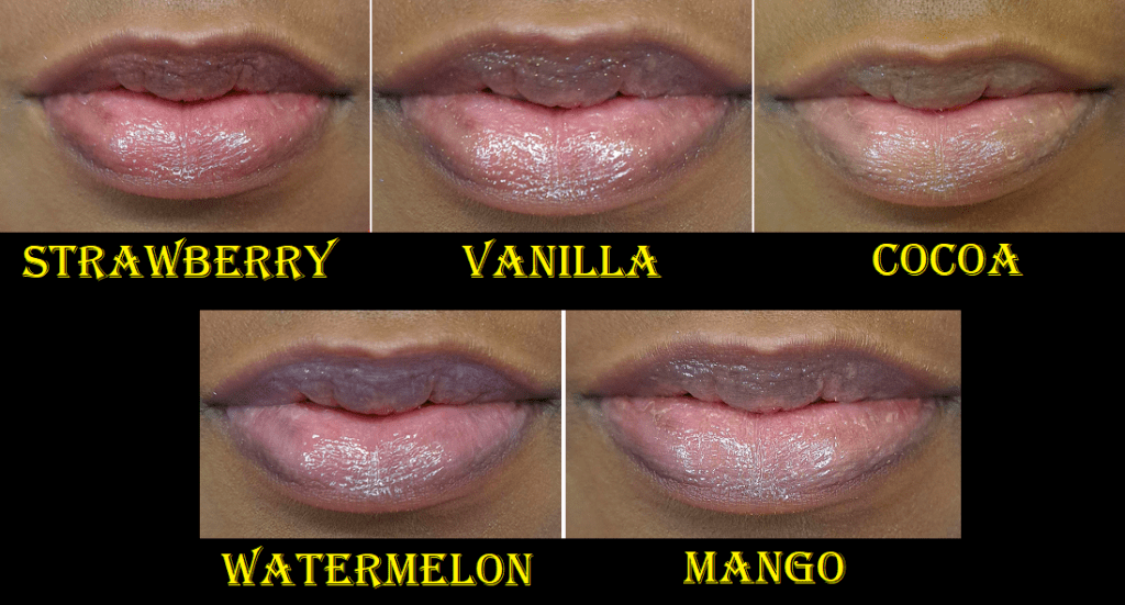 Regarding the colors, Watermelon gives me the tiniest pink tinge to my lips, but it’s not my favorite tone. I don’t see any shimmer in Watermelon, but Mango has micro gold shimmer. Mango and Cocoa Kiss are way too light and give a unflattering milky look to my lips, so I definitely don’t wear them in public and mostly just enjoy them for their scents. Watermelon smells like a delicious Watermelon Jolly Rancher candy, whereas Mango smells so faintly that I’m not sure I would have been able to figure it out based on the smell alone. It’s vaguely fruity with a tinge of mango. Cocoa Kiss does smell like slightly artificial hot chocolate. I still enjoy that smell though.