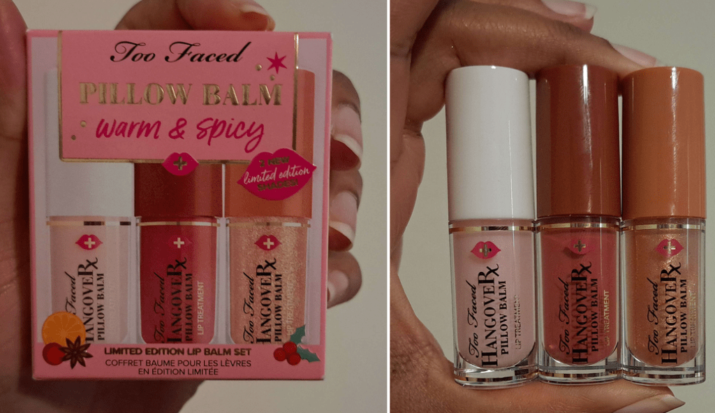 *BONUS PHOTOS: I ended up getting a discount and buying this year’s Too Faced Warm & Spicy: Pillow Balm Lip Balm Trio Set. I plan to gift the original one away, but I have swatches of the other two.