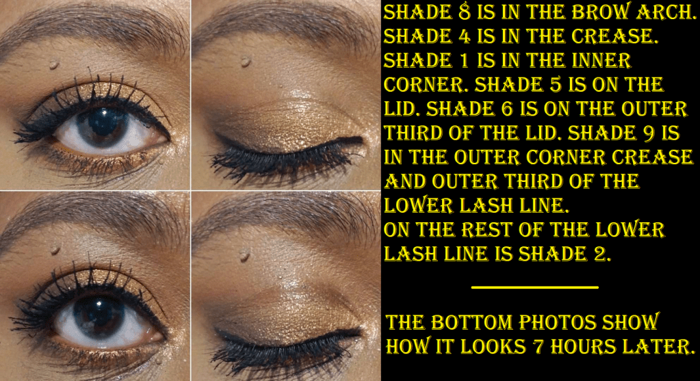 I think gold shades and warm tone neutrals are pretty, so I couldn’t resist this palette any longer. Shades 1, 3, and 9 are similar matte quality to the other Obsessions palettes, but not quite the same level, and I’m not sure why that’s the case. They’re a little more dusty in texture, but they blend well enough not to bother me. I just notice the slight difference. The pigmentation level is the same for all except Shade 5 which had to be built up in multiple layers to last on my eyes. This is still a better performing yellow than some in my collection that are usually made too thin and dust away, or are mixed with too much white base, so I’m not unhappy with it. The only matte that gives me considerable trouble is Shade 7, which is patchy. I had to tap on quite a bit of product to get it to cover the bald spot and by the end of the night I still ended up with it looking strangely. Because I still have Shade 3 as a deepening option, I can forgive Shade 7 being a bit of a dud. I also give props for having distinctly different matte colors.