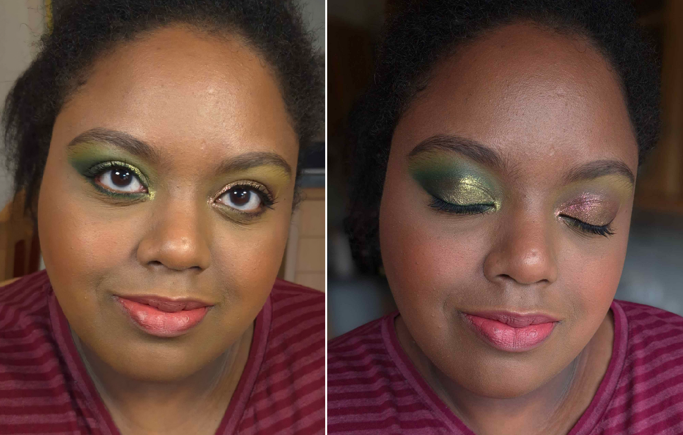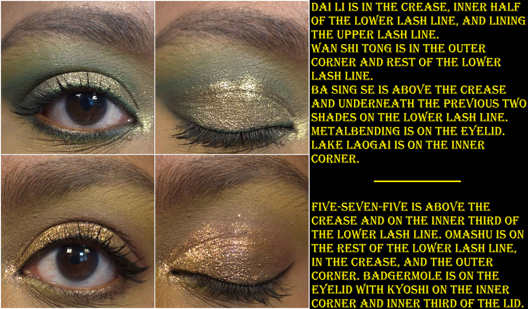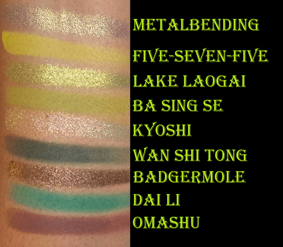 For starters, I am so on board with this color story! If I’m going to wear yellow leaning greens or blue leaning greens, these are the shades I prefer. I love how bright Dai Li looks, although it darkens on my lids if used with other dark shadows or on one of my wetter primers. I’m not sure if Metalbending is technically a duochrome, but at the very least it has a beautiful yellow-green shimmer on what looks to be purple-grey base. I’m not the most knowledgeable about color theory, but on my eyes it looks like it leans on the cooler side of yellow. It has been a long time since I’ve used Lethal Cosmetics shadows and the shimmers seem more to my preference now than before. They don’t feel as thick, but they go on smoothly and opaque. I don’t know if the brand necessarily increased the sparkle level; it appears the particle size of the shimmers are just bigger. Kyoshi is a somewhat flaky multichrome. I have minimal fallout applying the shimmers with my brush and fingers, but Kyoshi gets messy if I try to apply it to my inner corners without dampening the brush.