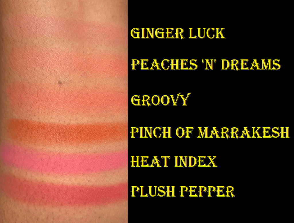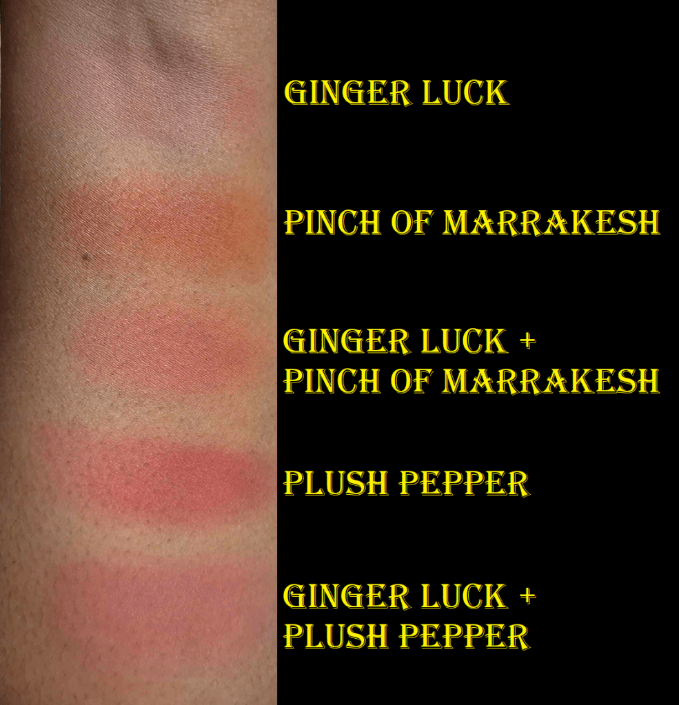 I also couldn’t help noticing the similarity in names of the new colors. I suspect Pinch of Marrakesh is inspired by the brand’s Marrakesh lipstick shade, since it’s an orange-red type of color. I wouldn’t be surprised if Plush Pepper was supposed to be a sister shade to Burnt Pepper, which looks slightly more red on the cheeks, whereas Plush Pepper has a bit more rose pink tone to it. For some reason, it’s the opposite when I swatch it on my arm, but on my cheeks that’s how it looks.