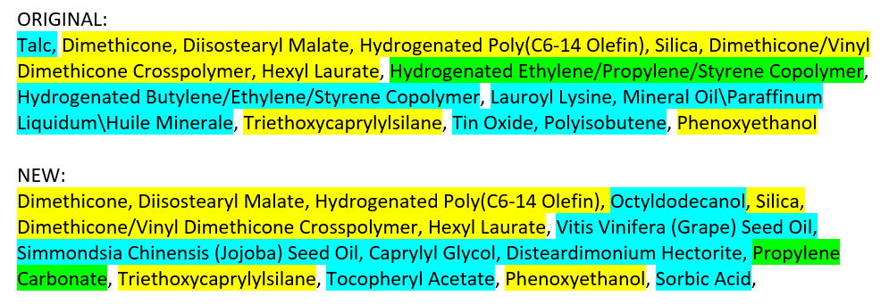 Aside from the added colors, the whole line has been reformulated. I don’t have any of the original boxes with me to compare, but I have the ingredient list from the Incidecoder website that has not been updated yet. Setting the “may contain” portion aside, the most notable changes seem to be the removal of talc and replacement of mineral and synthetic oils with naturally derived oils.