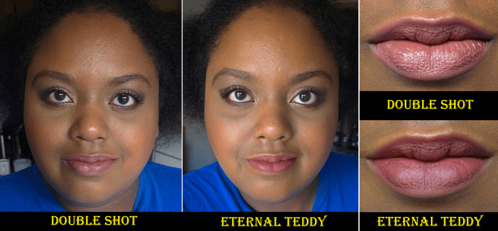 Once again, I’m dealing with constantly shifting natural lighting and my artificial lights wash me out too much, so these lipstick shades are hard to capture accurately. I did my best. Even though I’m wearing the same shirt as the Ginger Luck photos, which were added to this review a week before publishing, these pictures come from day 2 of trying to work around the constant fading in and out of light due to the cloudy weather here. I tried a third time (also in the same shirt) with at least Double Shot, but lipsticks look different on everyone anyway depending on their skin tone and the pigment level of one’s lips.